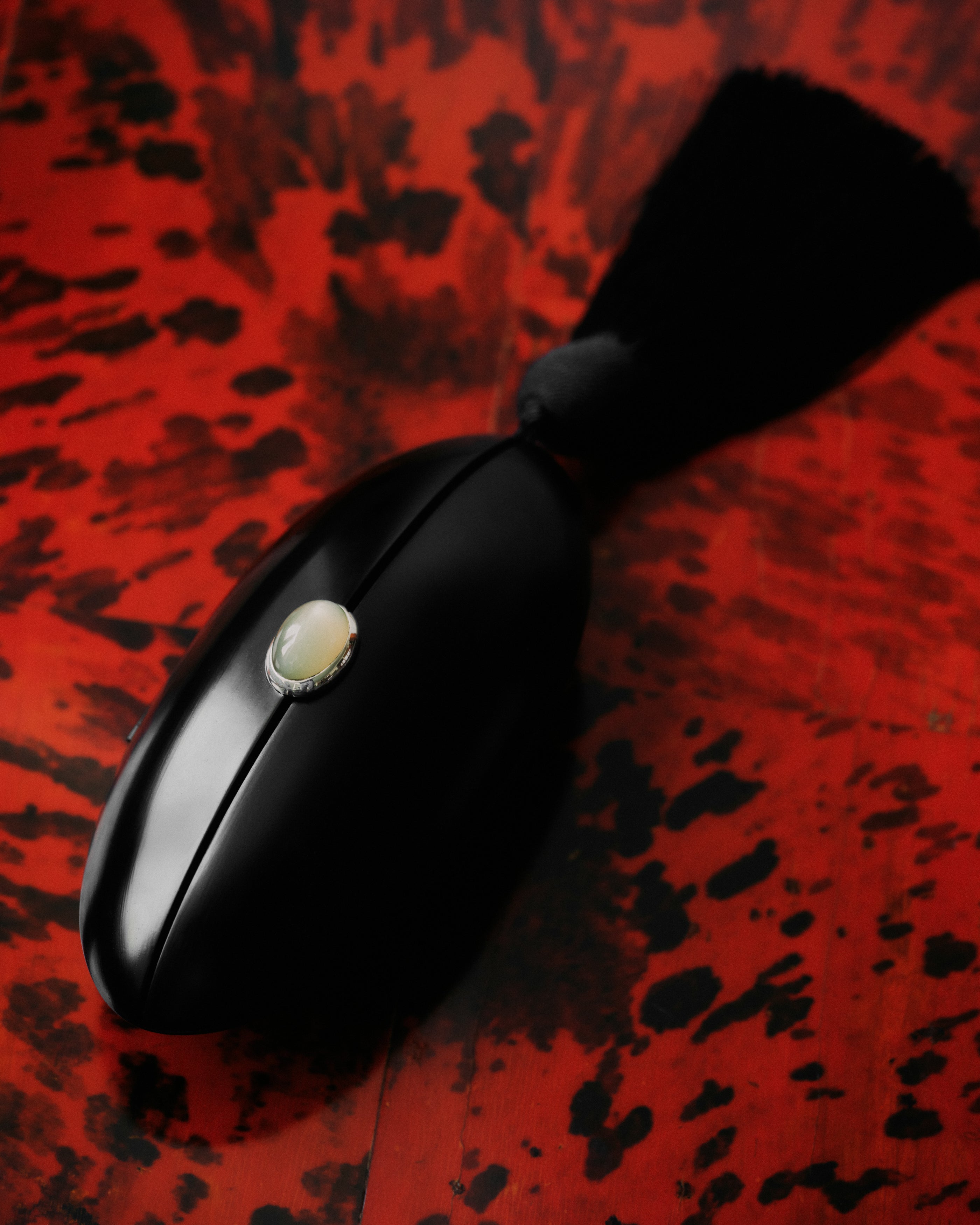Hand carved maple wood and black urushi lacquer minaudière. Featuring a large one-of-a-kind yellow moonstone closure set in sterling silver with a silk tassel detail.