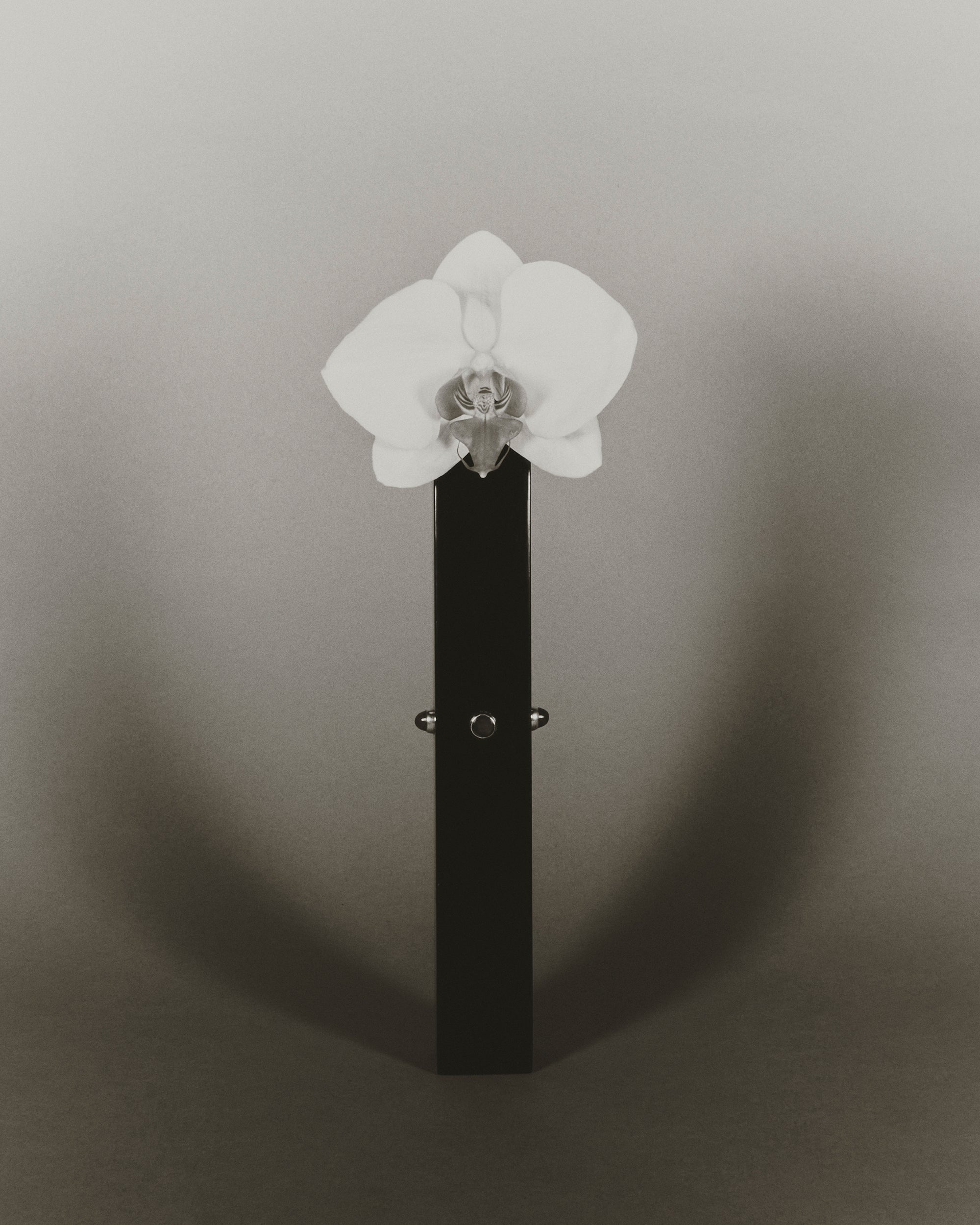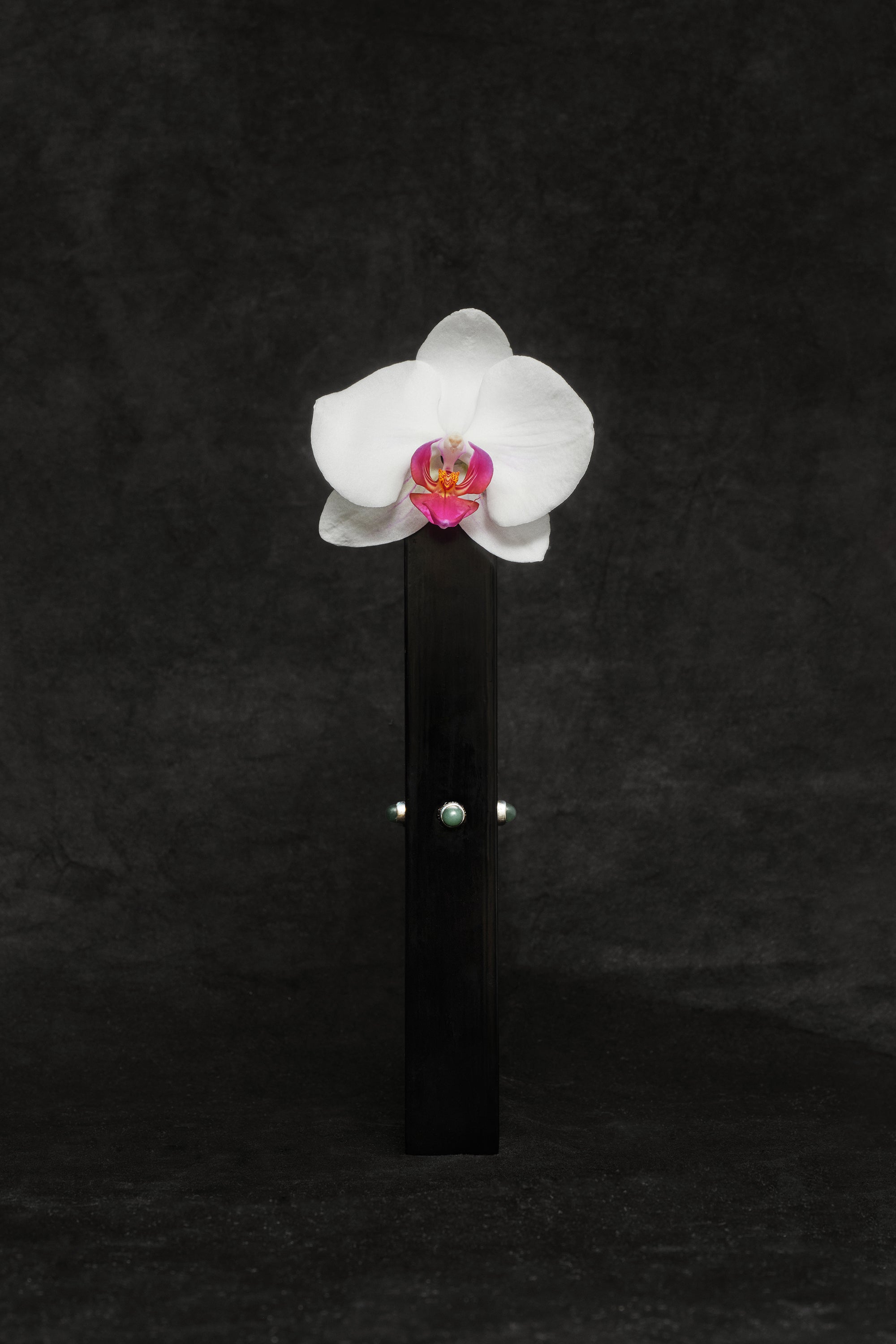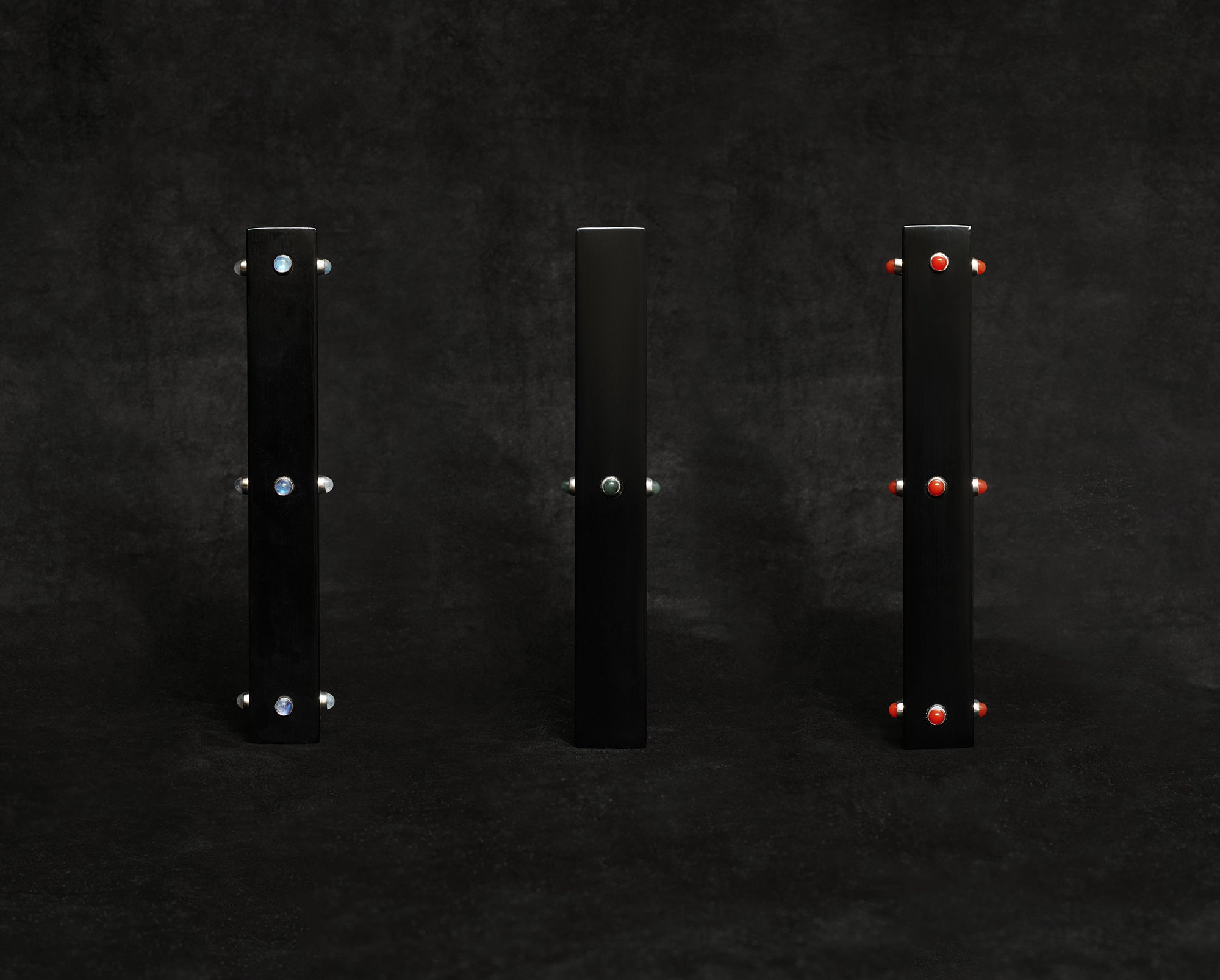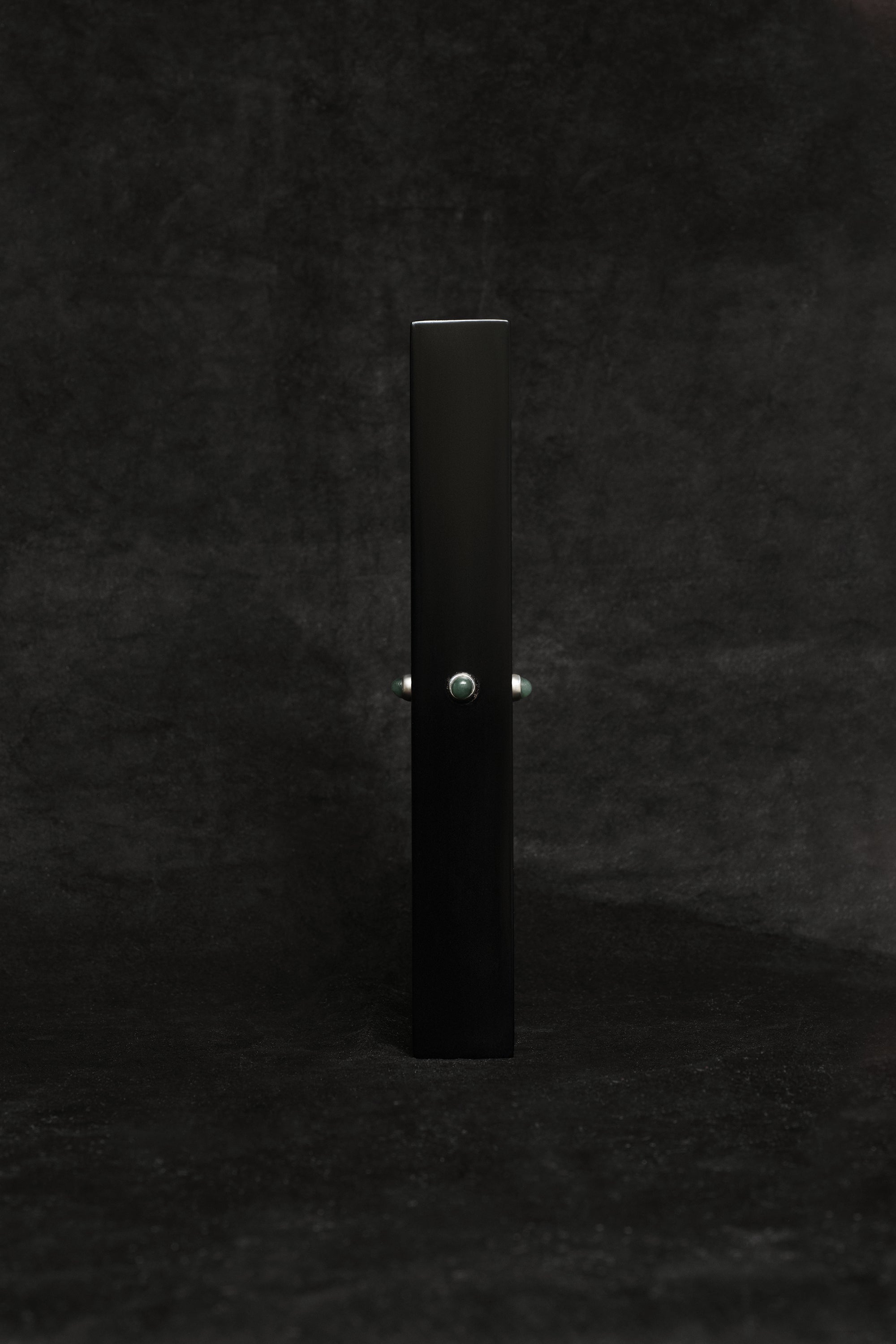 Black urushi lacquer bud vase with jade cabochon details. Edition of Three.