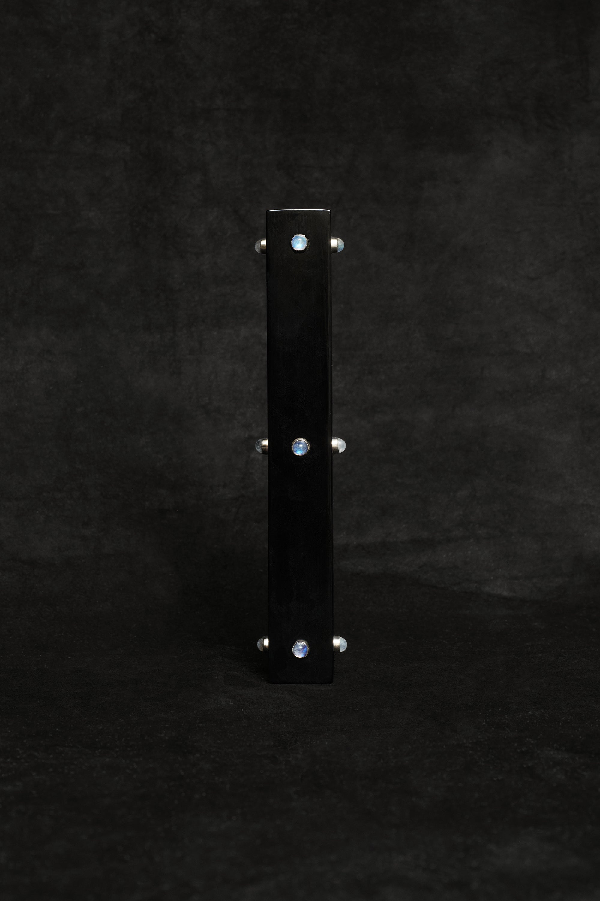 Black urushi lacquer bud vase with moonstone cabochon details. Edition of Three.