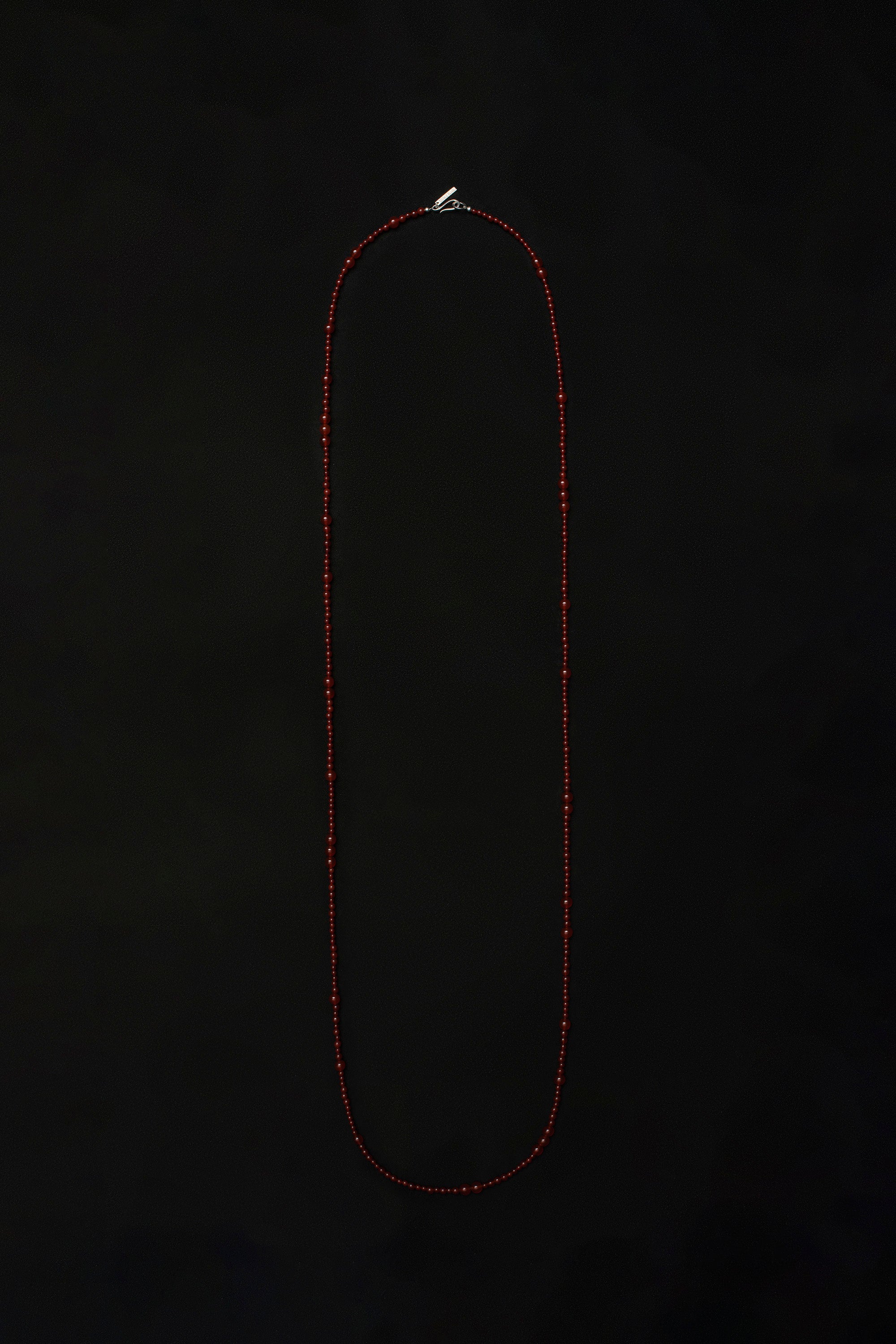 Necklace featuring a variety of carnelian beads on a silk string with a sterling silver closure. Available in three lengths.