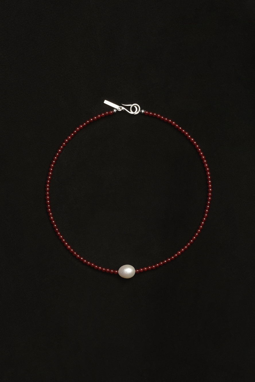 Delicate carnelian beaded choker featuring a freshwater pearl with a sterling silver closure.