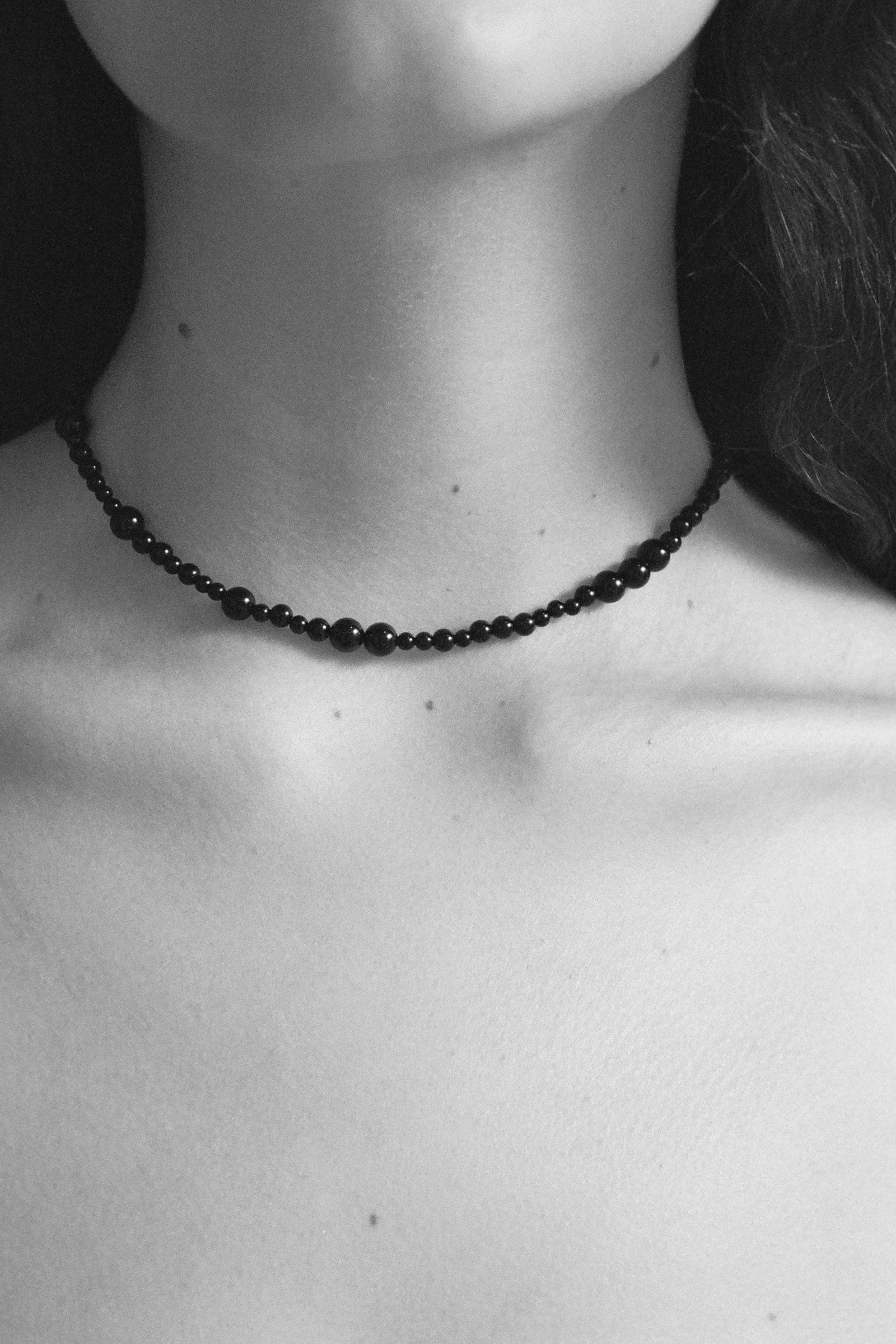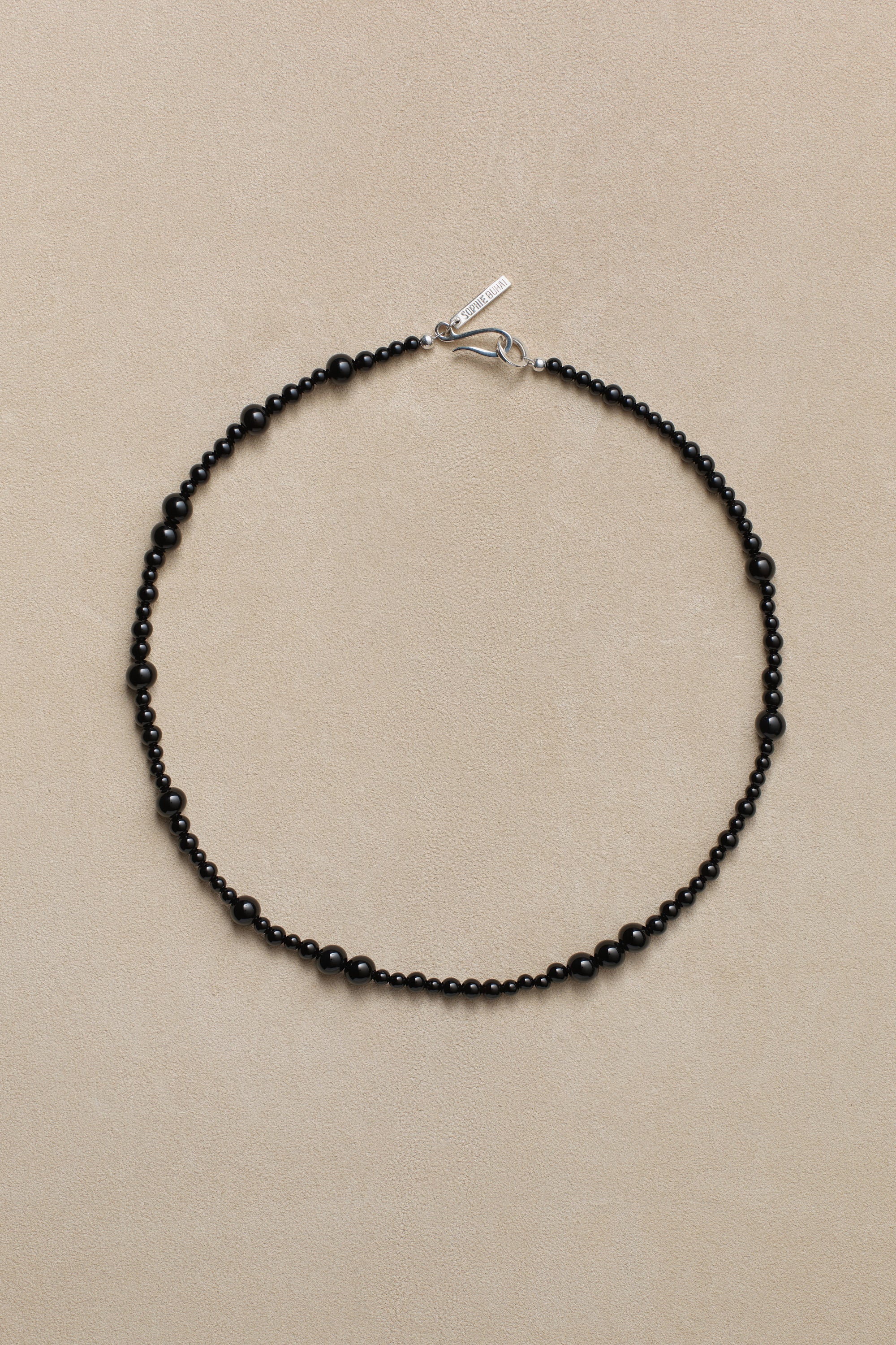 Necklace featuring a variety of onyx beads on a silk string with a sterling silver closure. Available in three lengths.