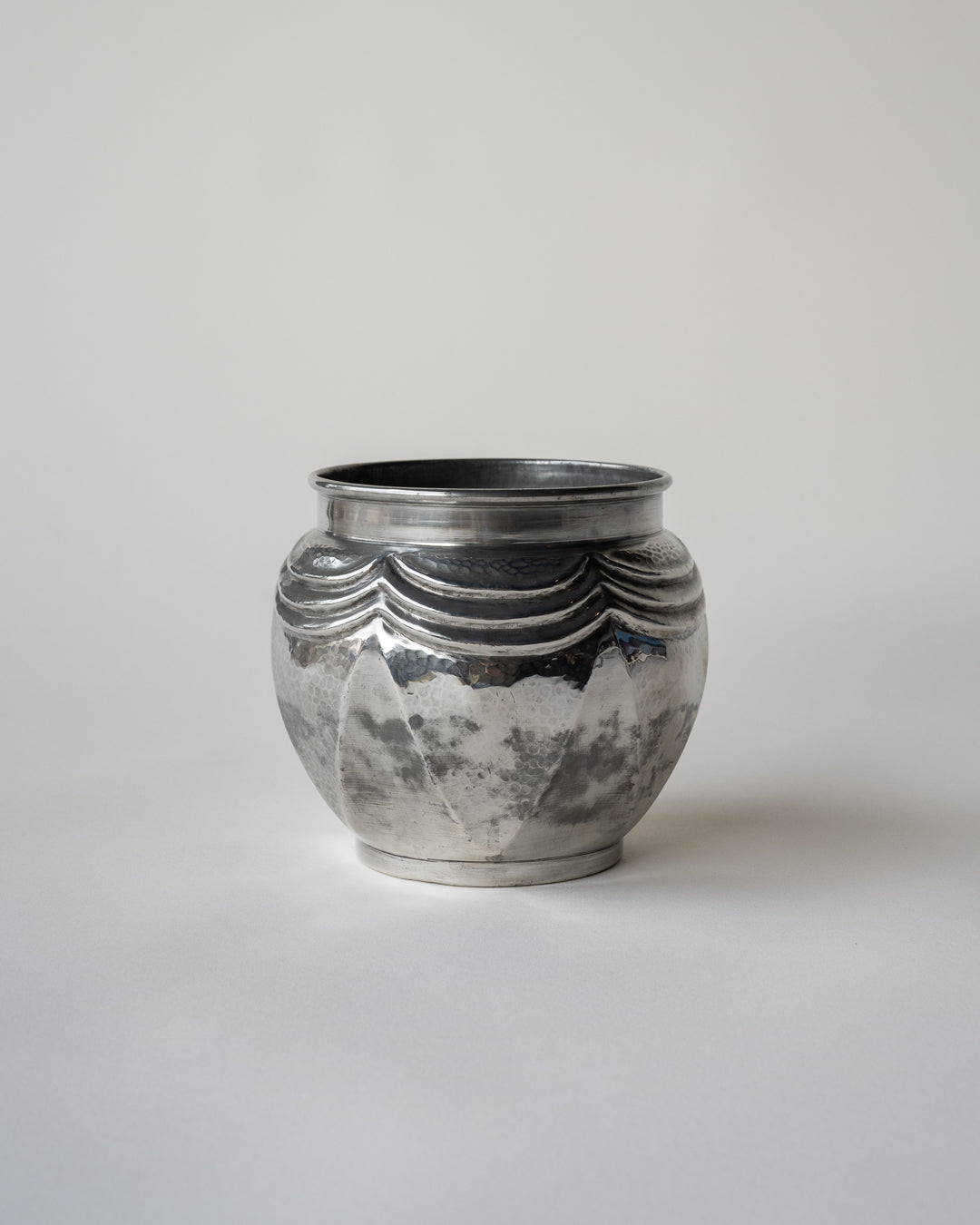 A hand-hammered cache pot in pewter by Alice and Eugene Chanal circa 1930, perfect for a houseplant or orchid. Decorated with a subtle zig-zagged pattern on the body and a trompe l’oeil drapery decor in the upper portion. Stamped at underside “Alice & Eugene Chanal Déposé.” Showing a strong patina.