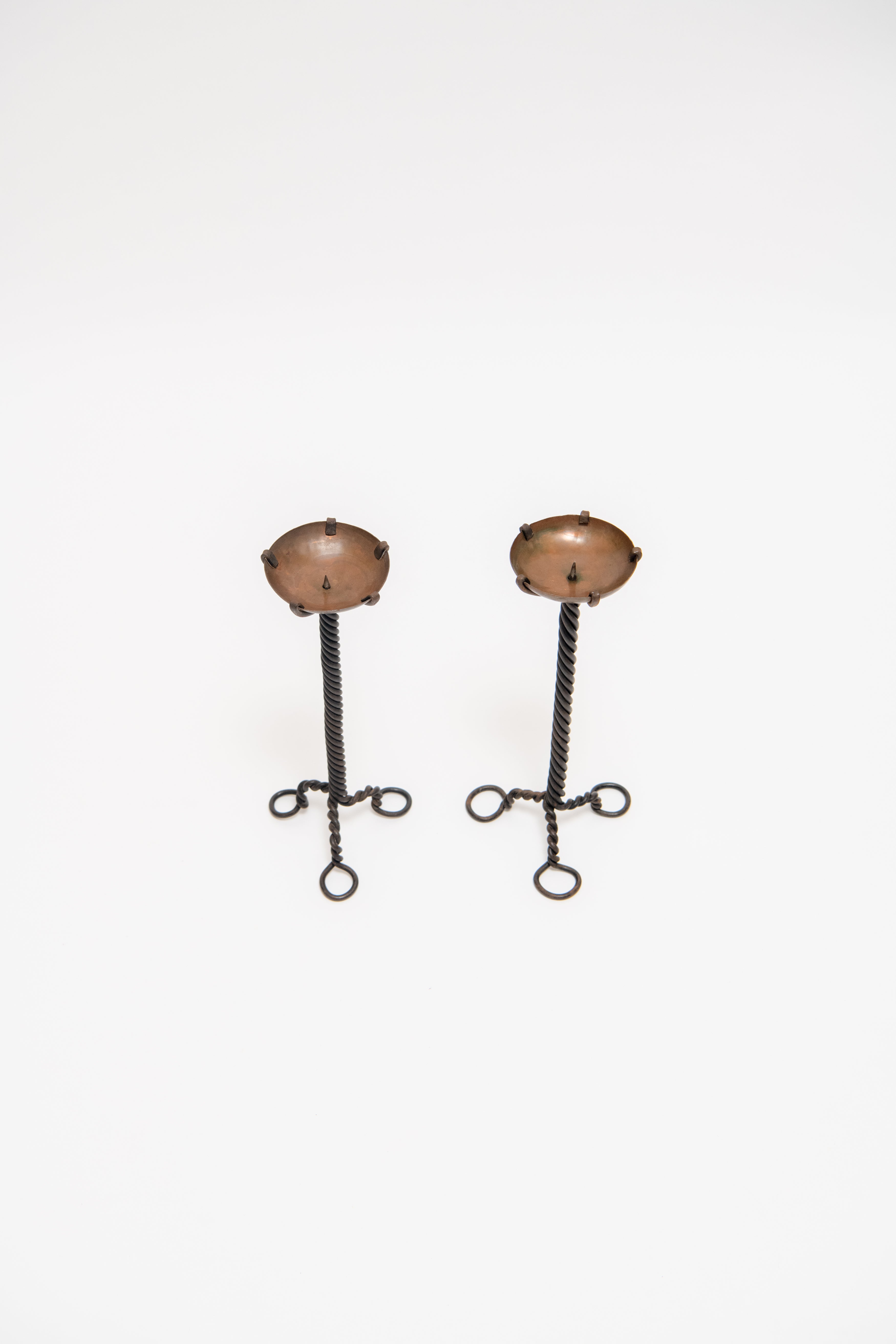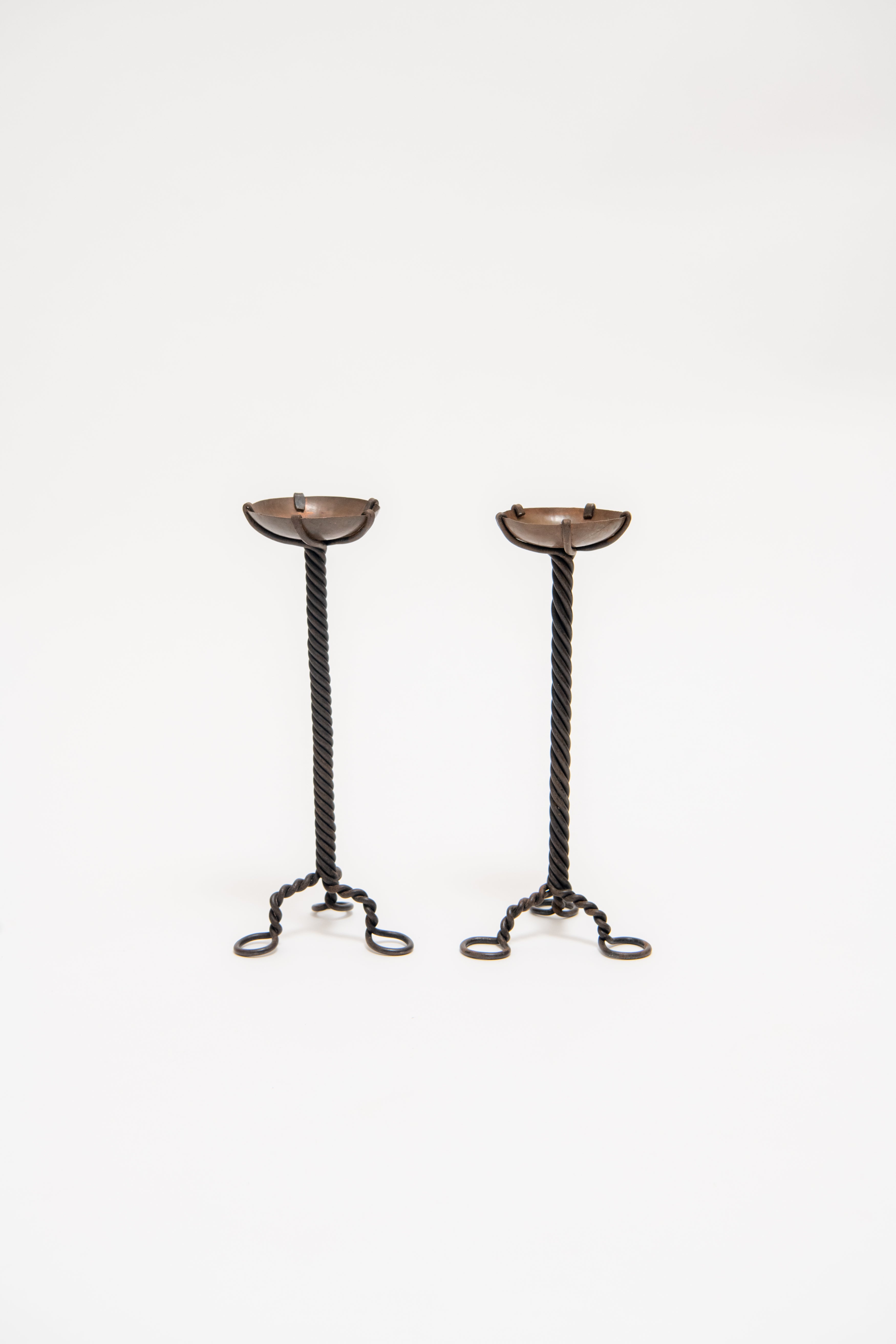 A pair of twisted mixed metal candlesticks in the style of Giacometti. Fits 3” wide candle or smaller.