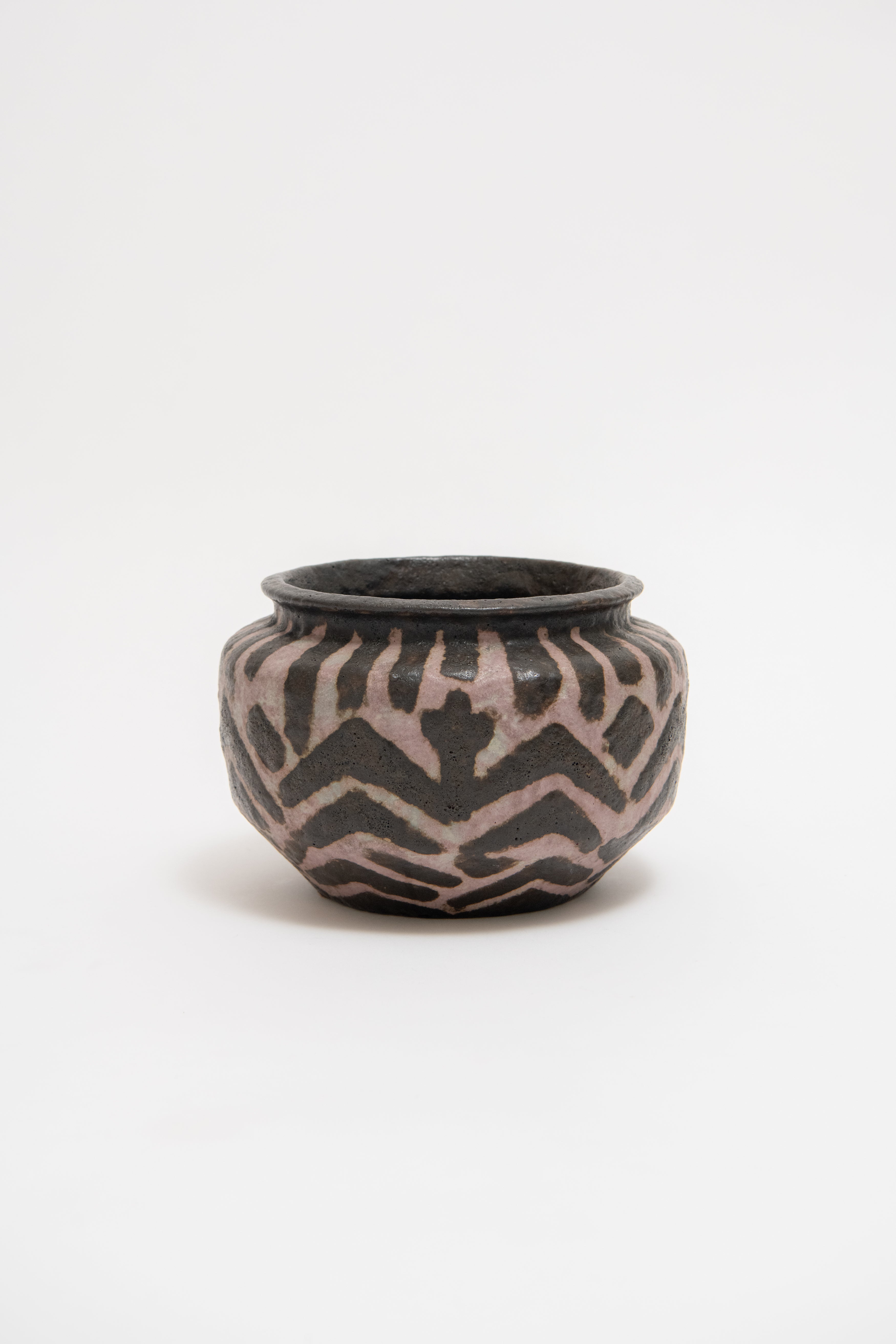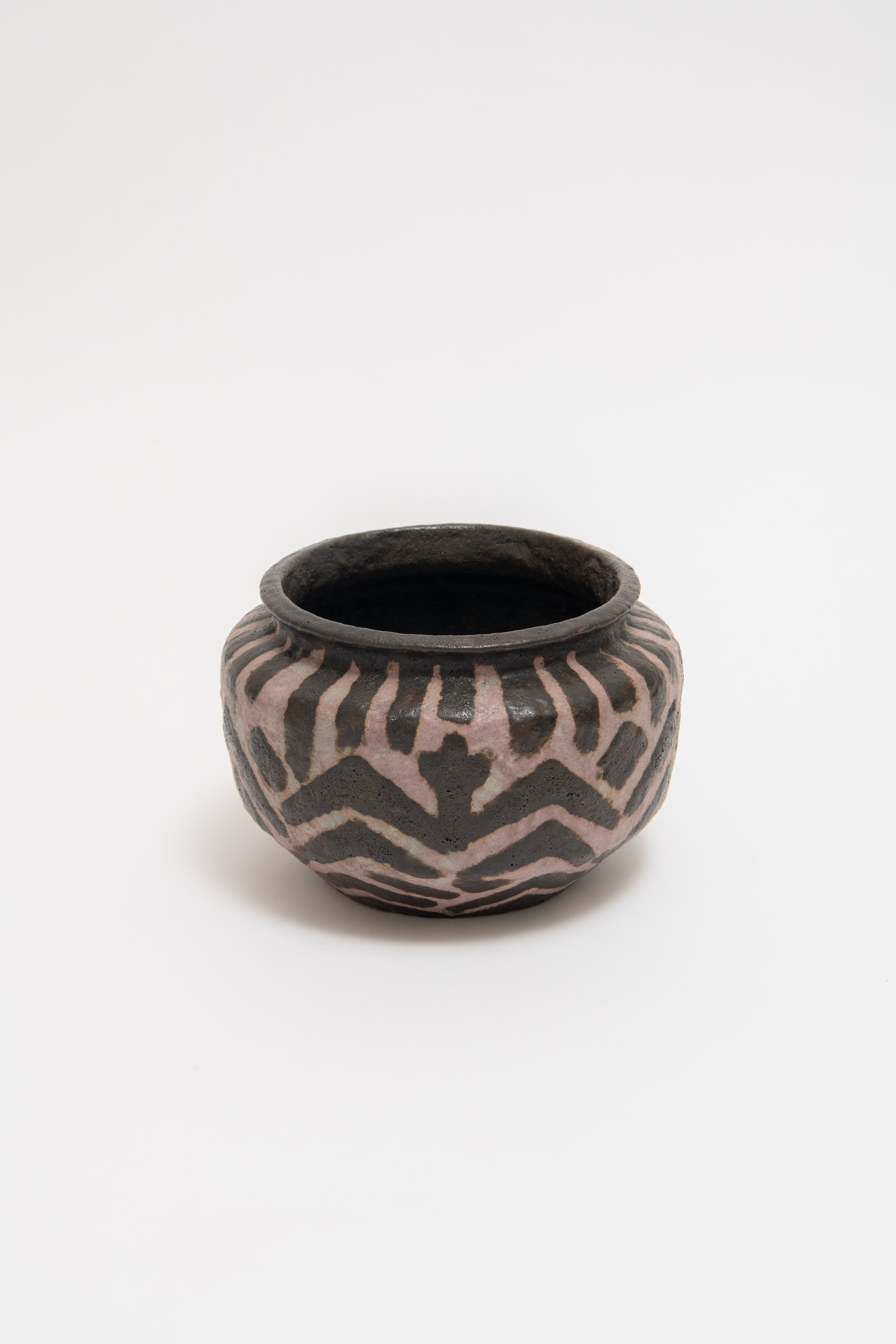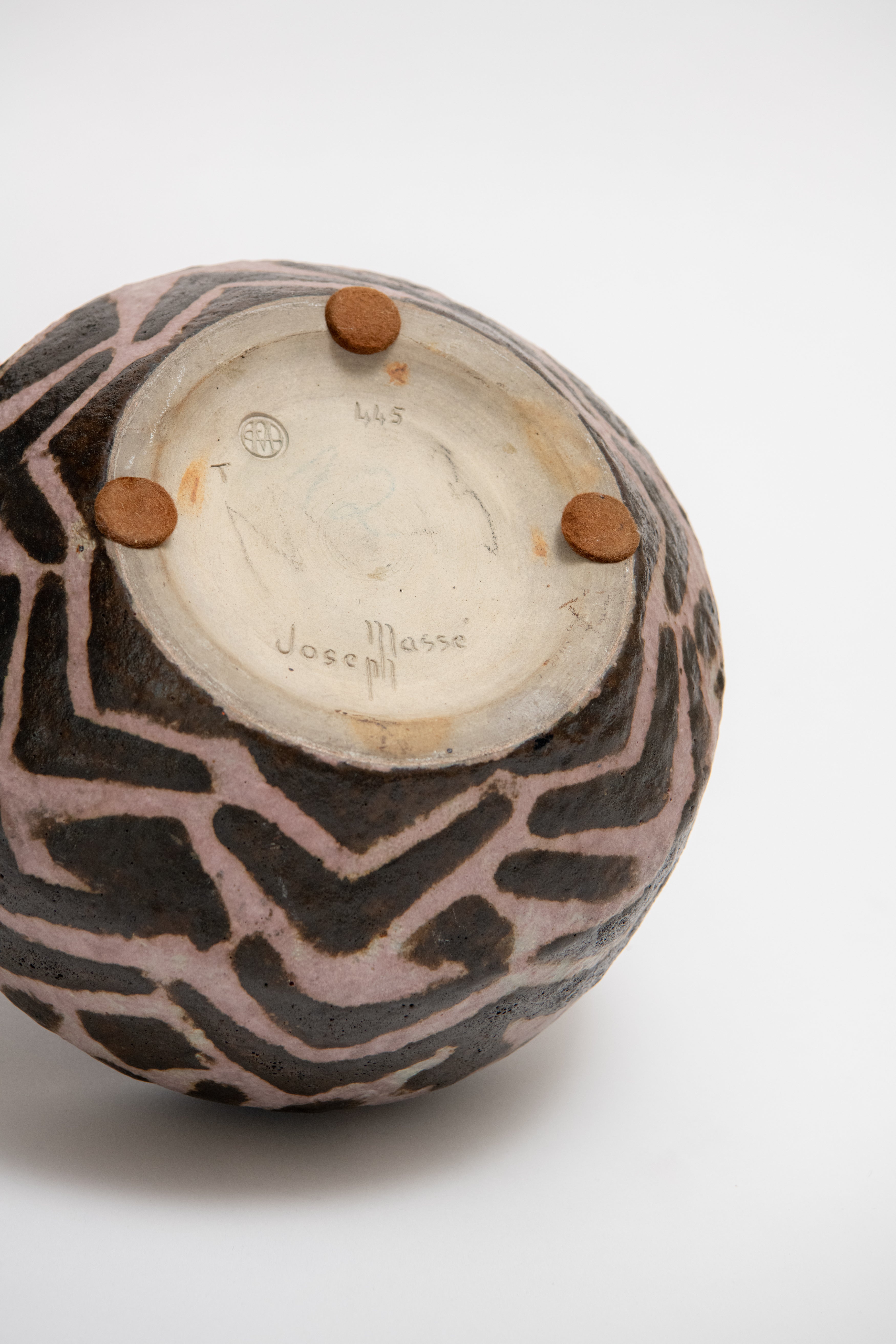 A substantial and heavy stoneware ceramic vessel decorated with African style motifs in a chocolate brown and mauve glaze by French artist Joseph Massé, a ceramicist of the Art Deco period who worked alongside sculptor Jean Carriès. Stamped and signed “Joseph Massé” at the underside.