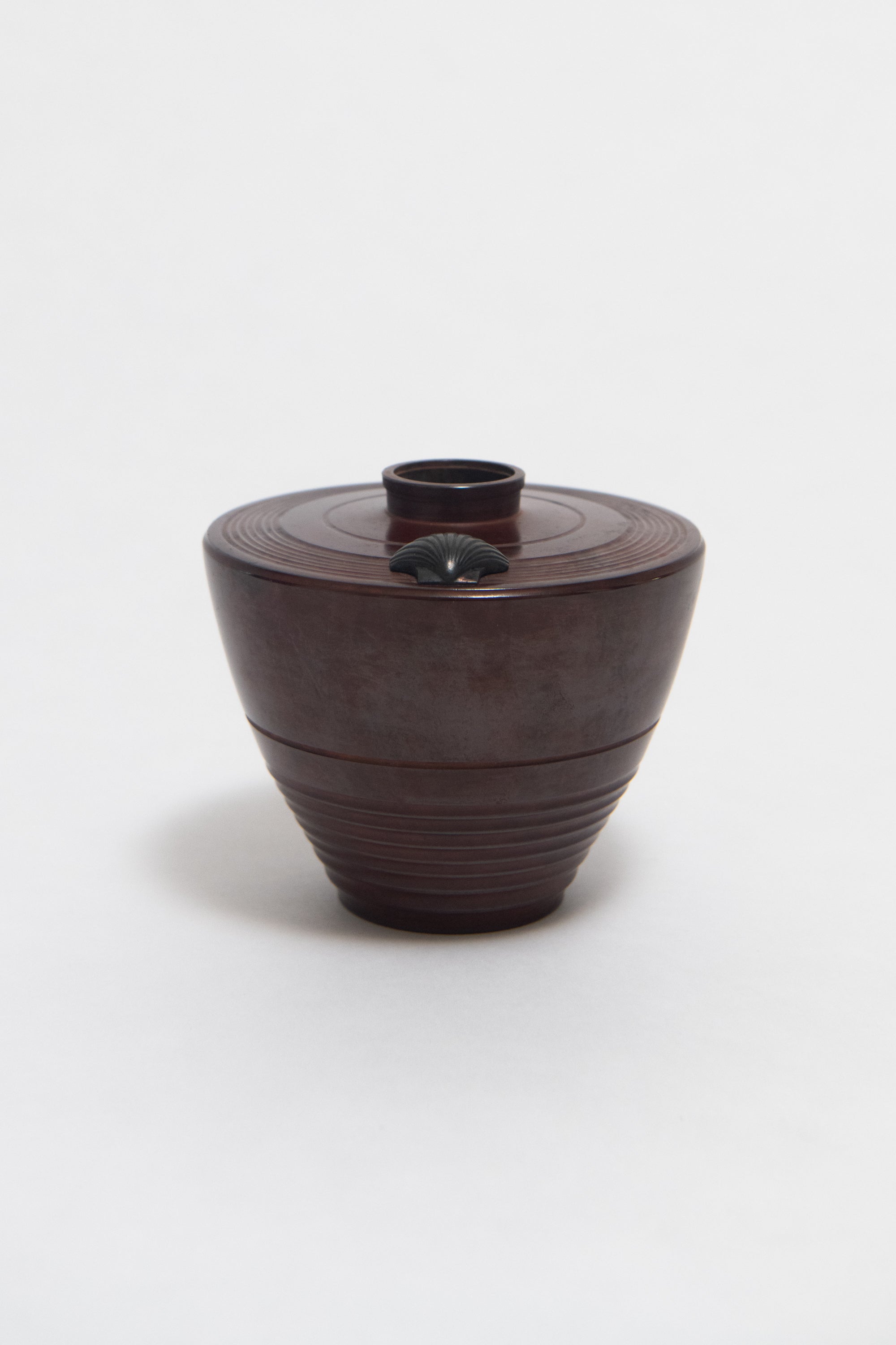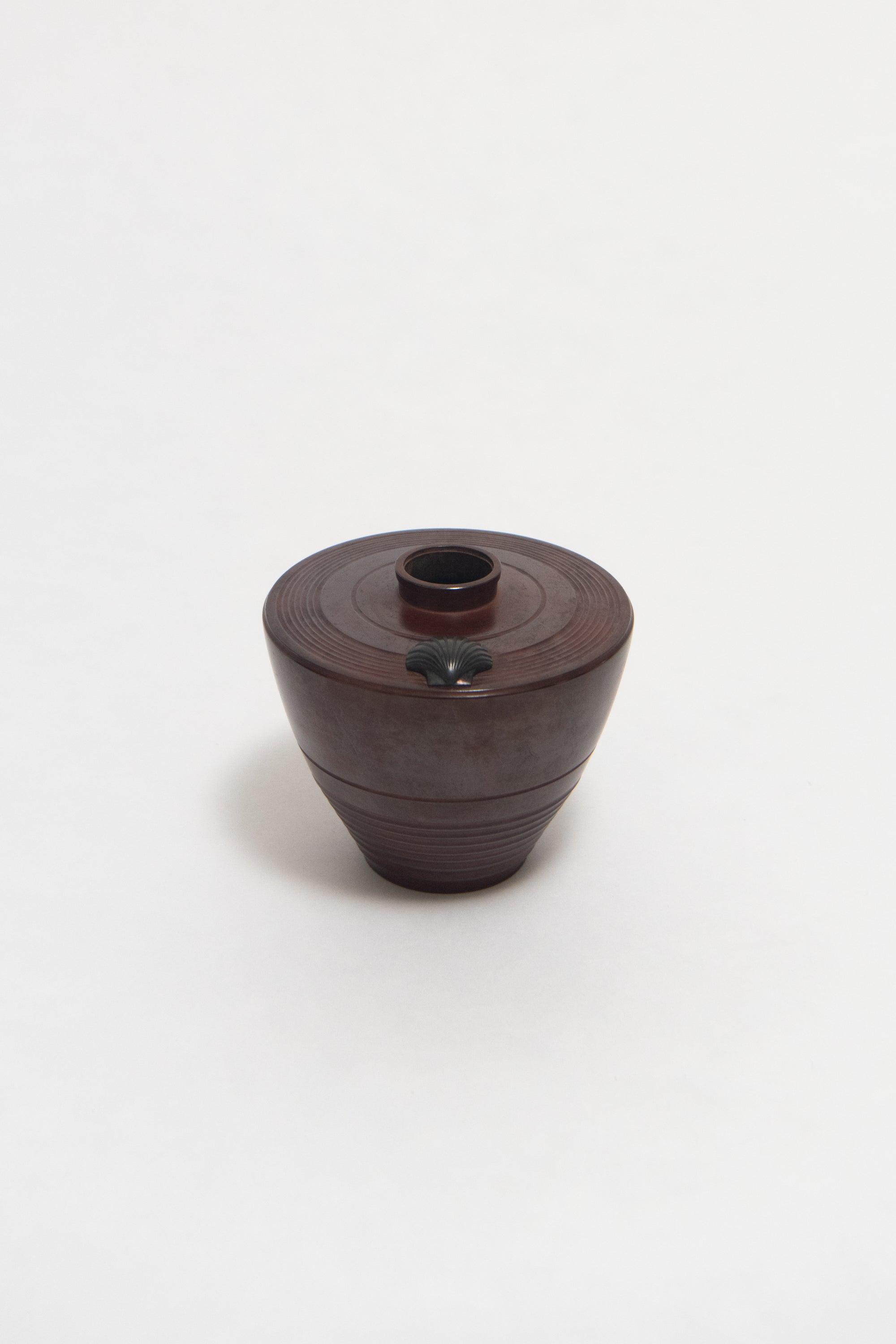 A mid-century Japanese copper/bronze vase with incised concentric circle details and a small shell appliqué at top.