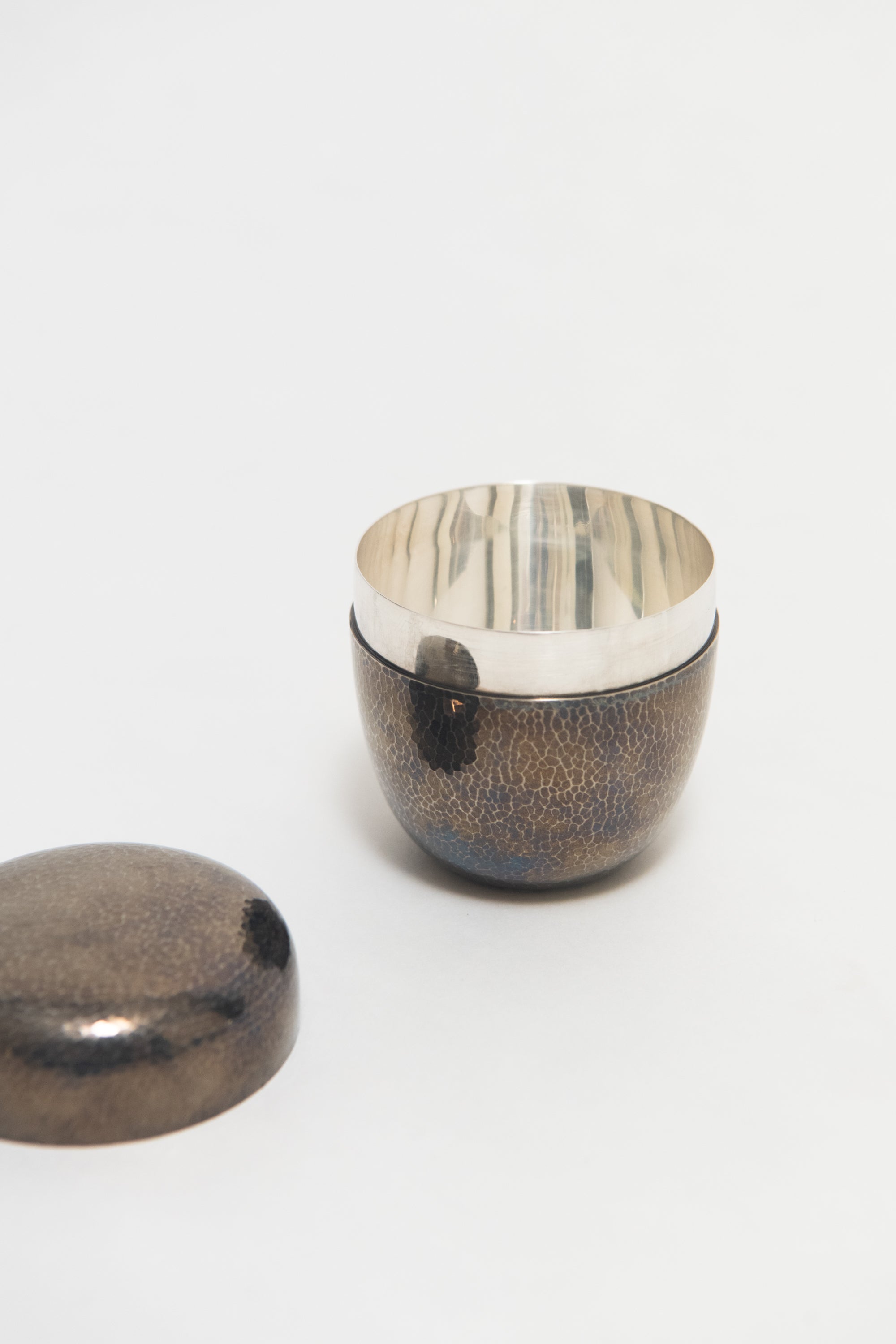 A lidded, silver container with beautiful, original patina and polished interior. The finely hammered, dimensional surface of this little box scatters light in the most beautiful way. Signed and stamped at base.