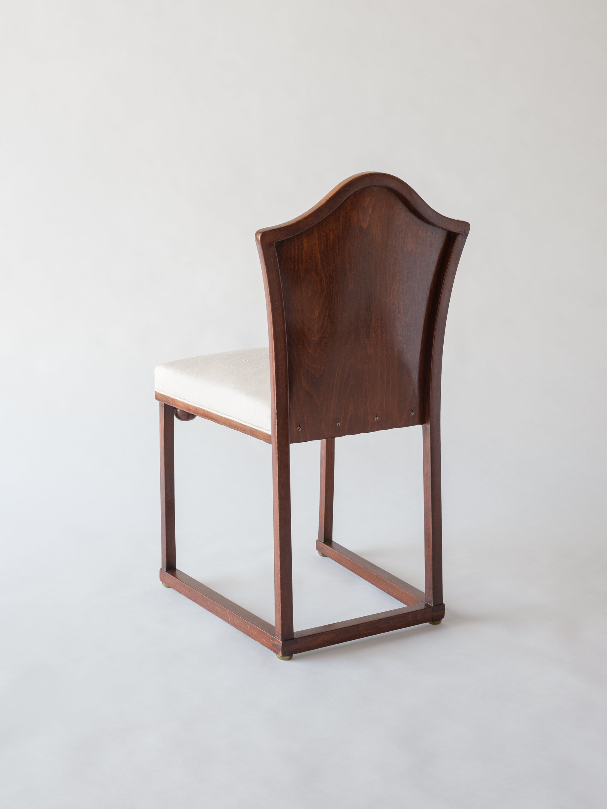A Vienna Secessionist bentwood chair with upholstered back and seat attributed to Josef Hoffmann, founding leader of the influential Wiener Werkstätte. Gracefully sloped back and corner ball enforcement details on front legs. Most likely manufactured by J. & J. Kohn. Reupholstered in a raw ivory silk by Pierre Frey. Priced as a single chair.