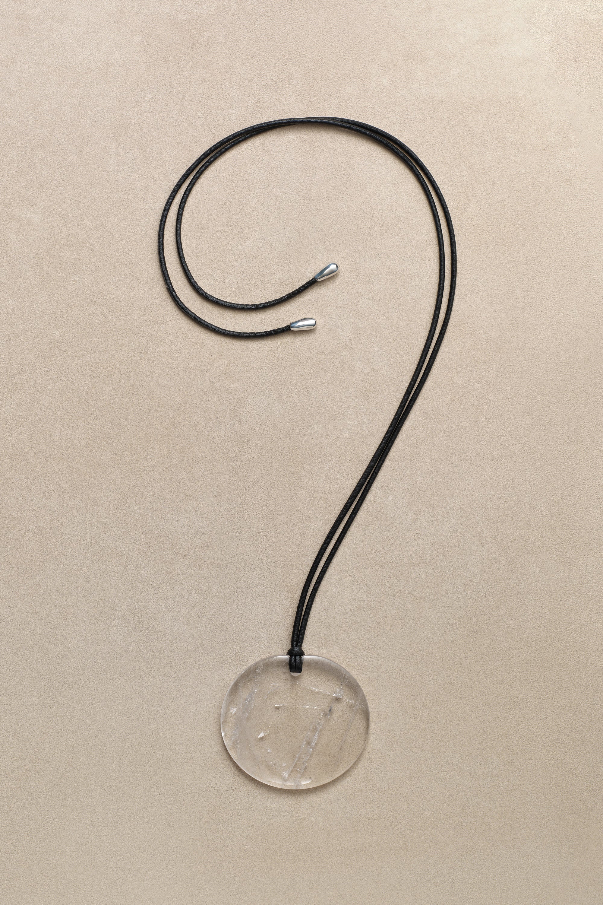 A hand carved quartz pendant on a vegan leather cord. Featuring sterling silver teardrop endings. Adjustable length. Available in three sizes.