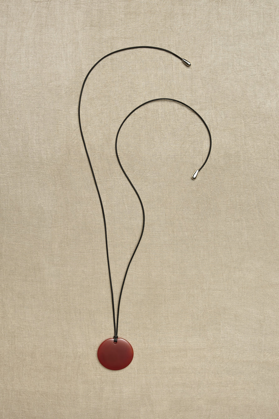 A hand carved carnelian pendant on a vegan leather cord. Featuring sterling silver teardrop endings. Adjustable length. Available in three sizes.
