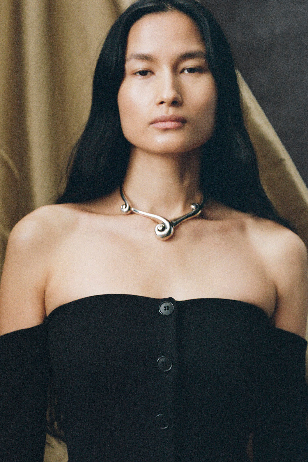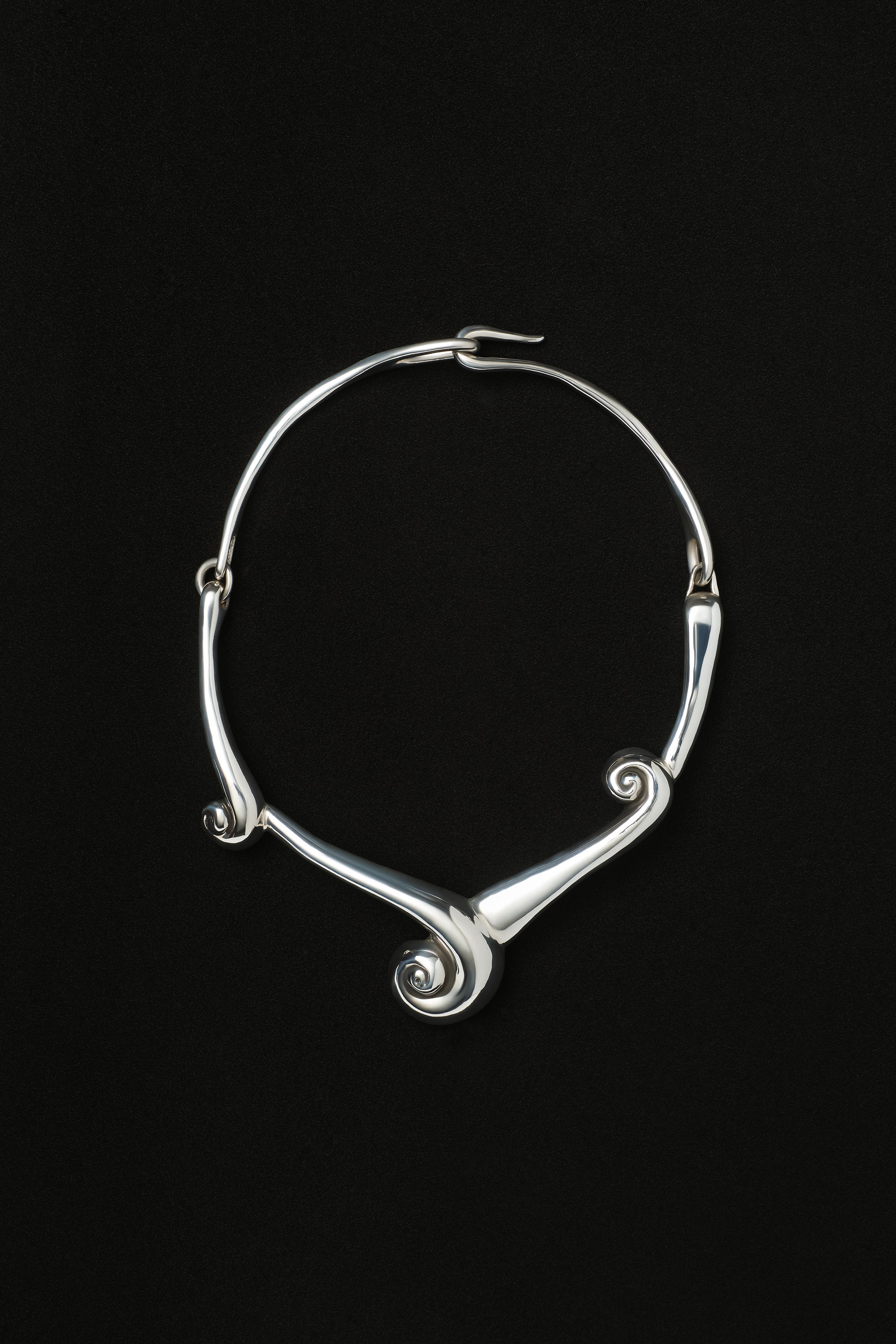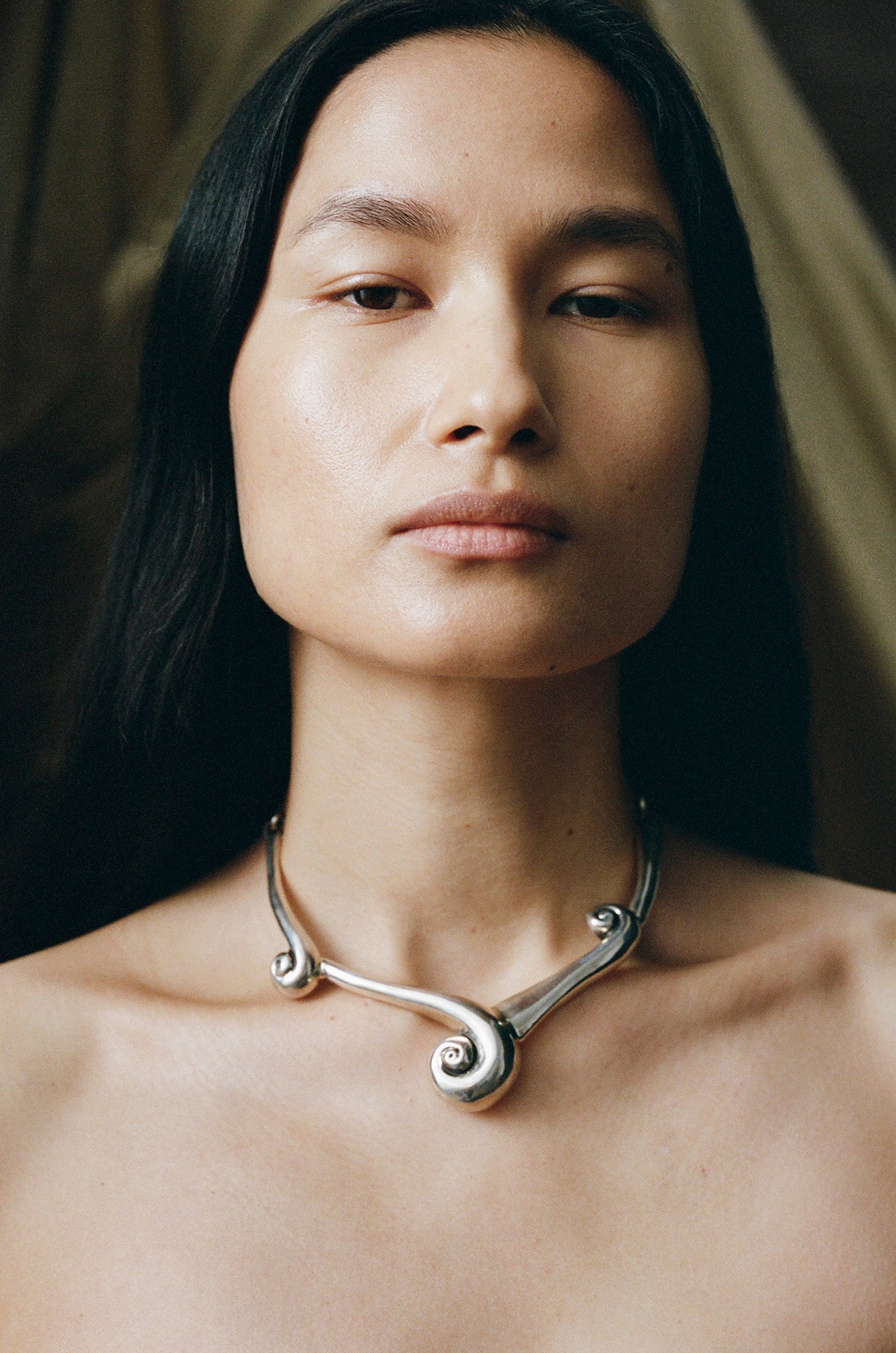 A bold collar inspired by the natural shape of a shell with a substantial yet comfortable weight.