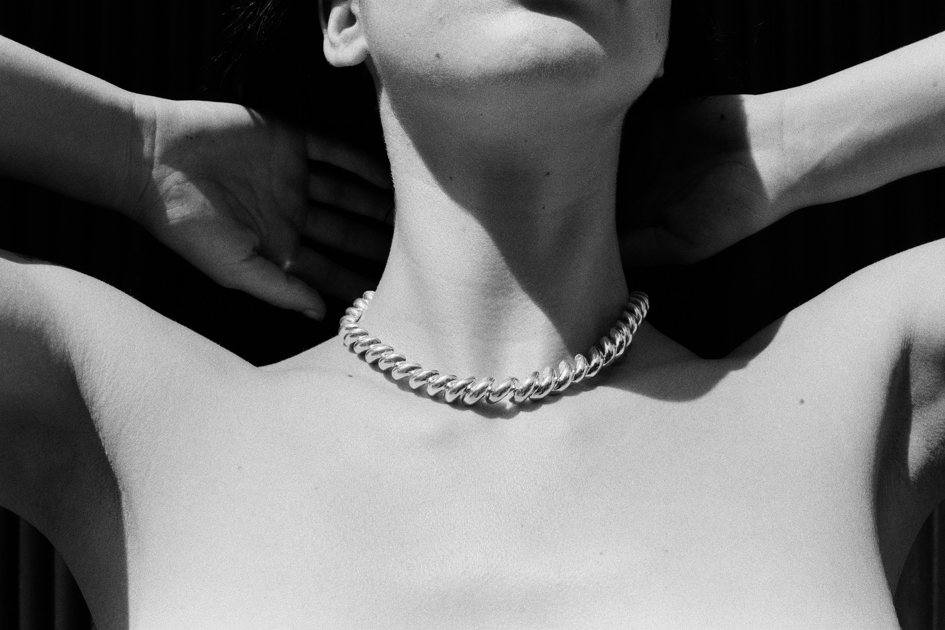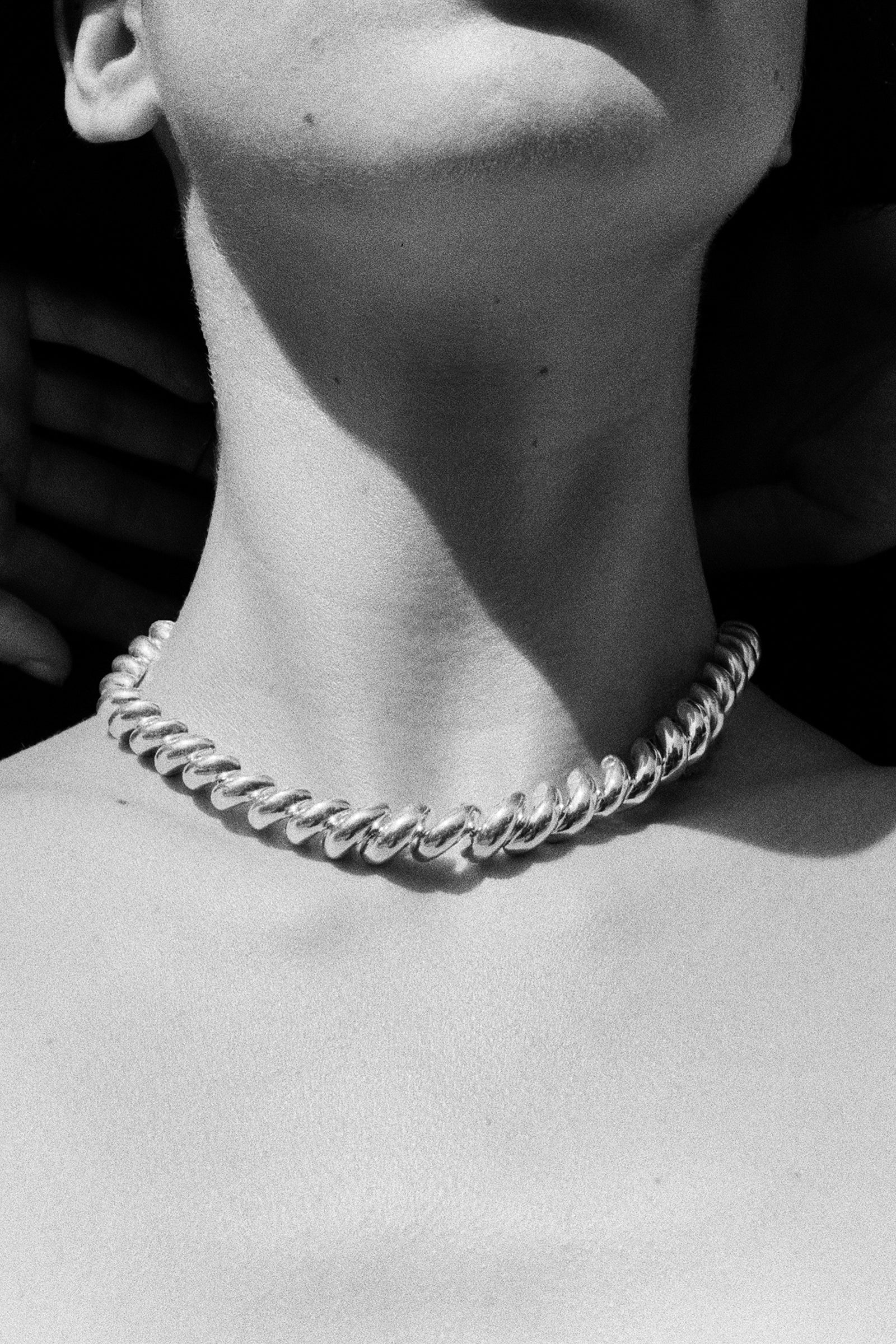 An elegant and timeless chain necklace made of handmade links with a notable yet comfortable weight. Beautiful worn on its own for a special occasion.