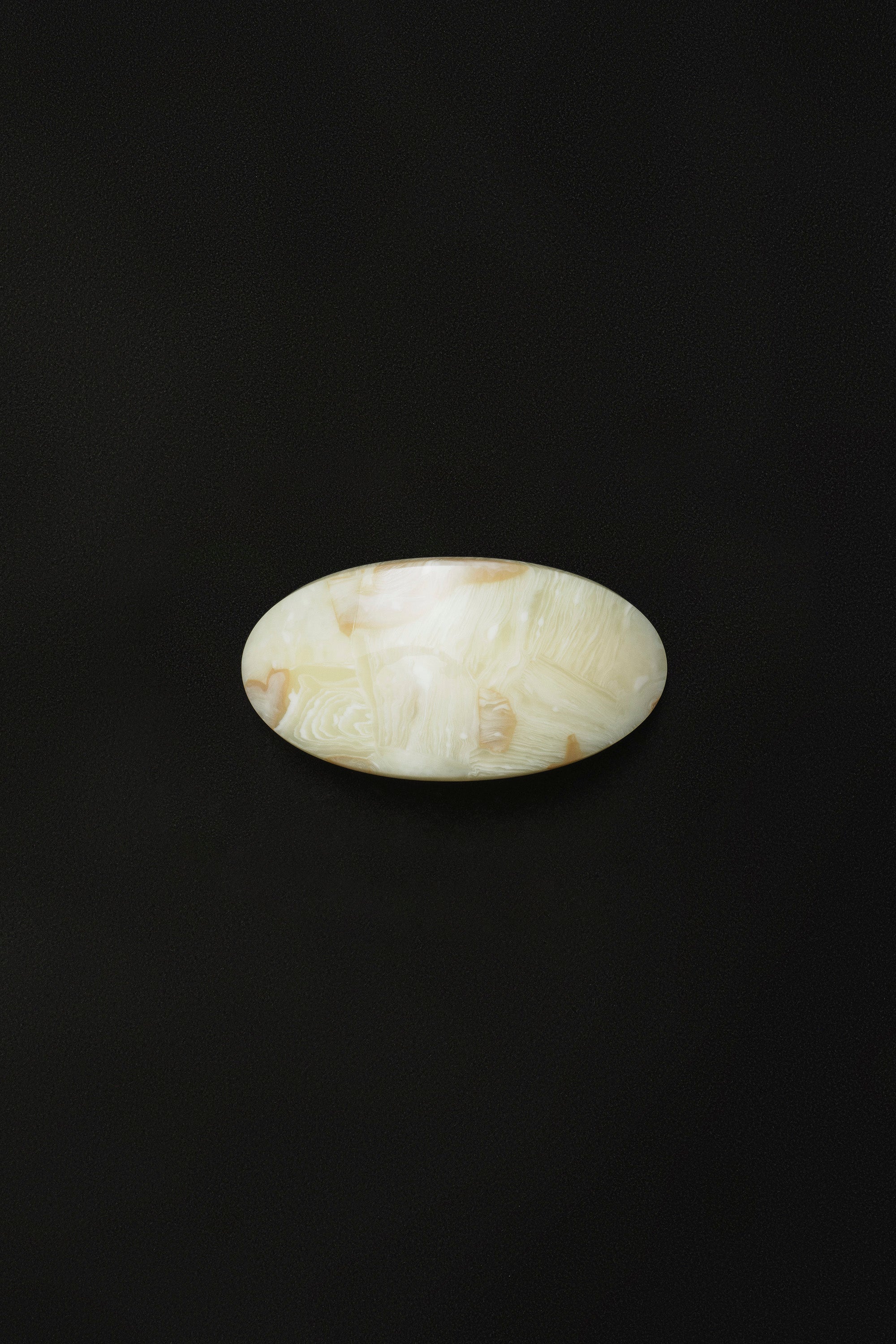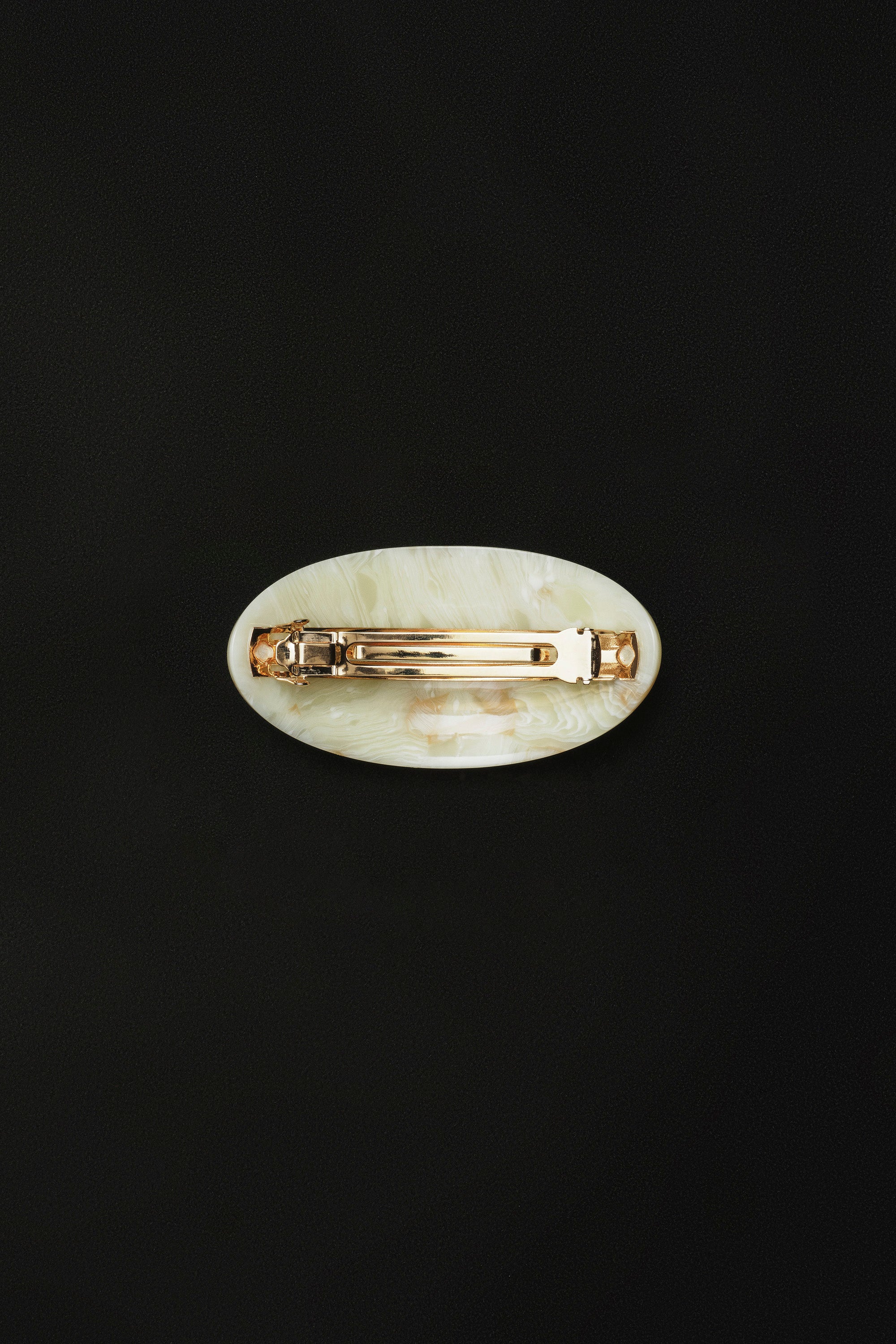 An oval shaped hair clip featuring a stainless steel French barrette. Made from acetate.