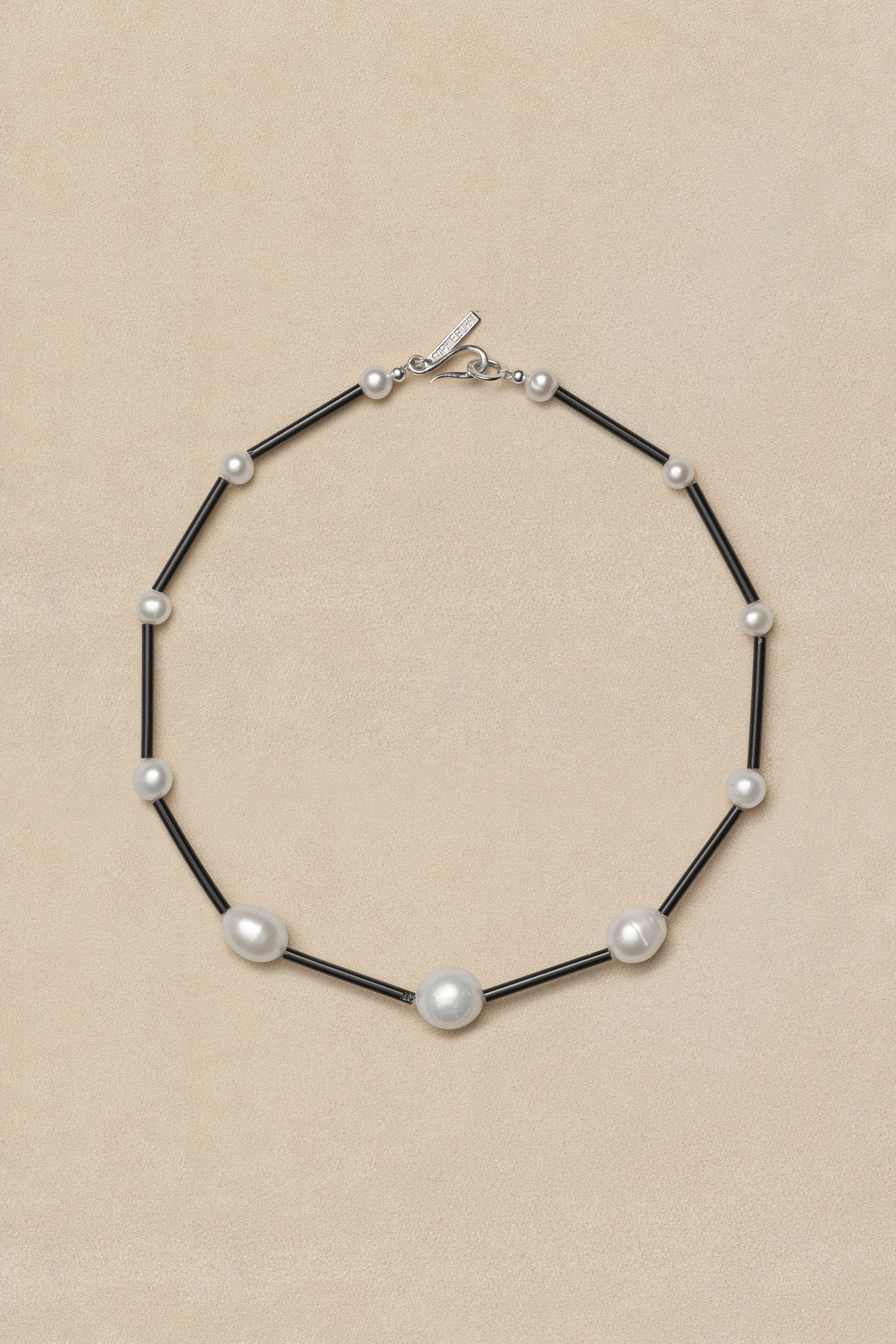An elegant necklace with freshwater pearls and Czech glass beads, strung on hand-knotted silk. Available in four lengths.