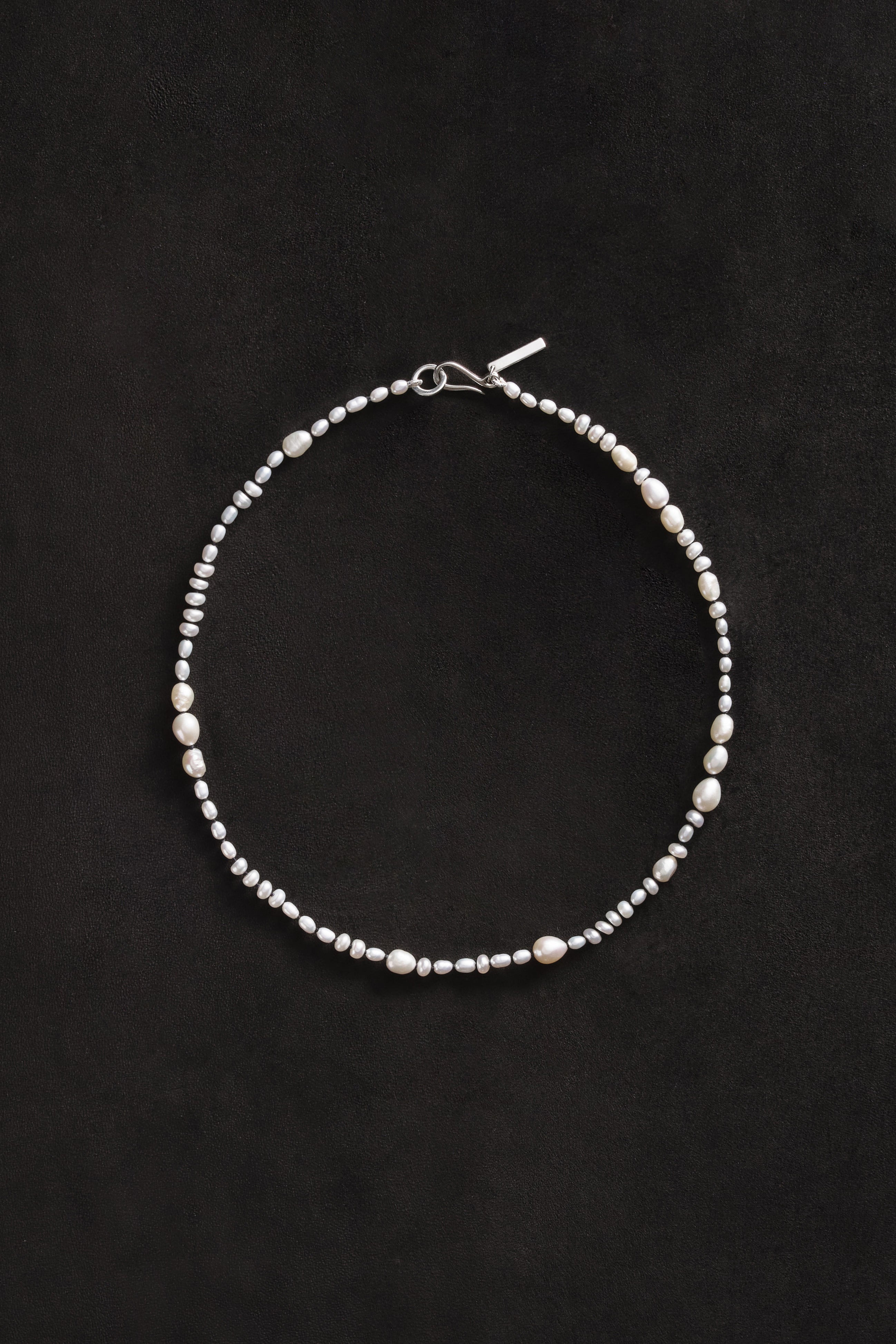 Necklace featuring a variety of freshwater pearls on a hand-knotted silk thread.