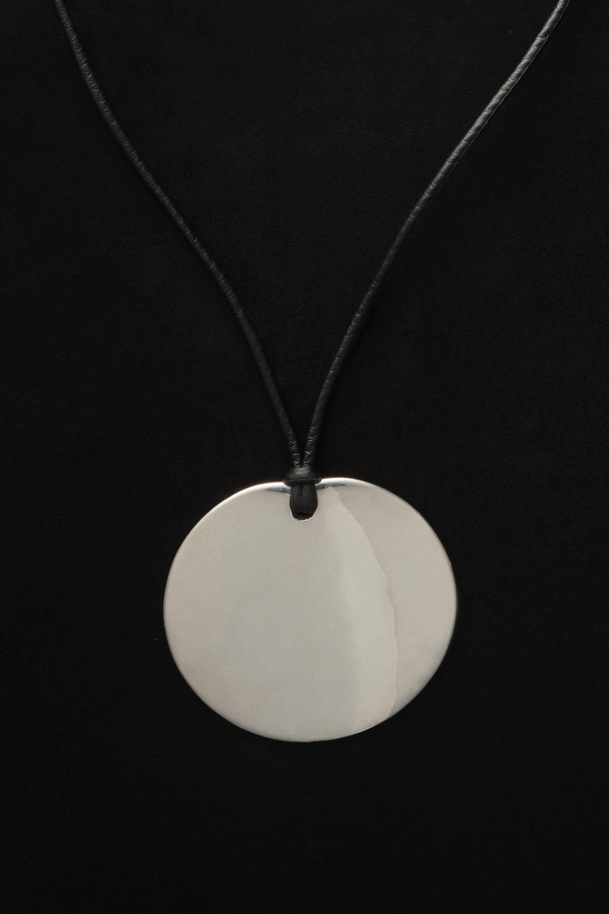 A sterling silver sculptural pendant on a vegan leather cord. Featuring sterling silver teardrop endings. Adjustable length. Available in three sizes.