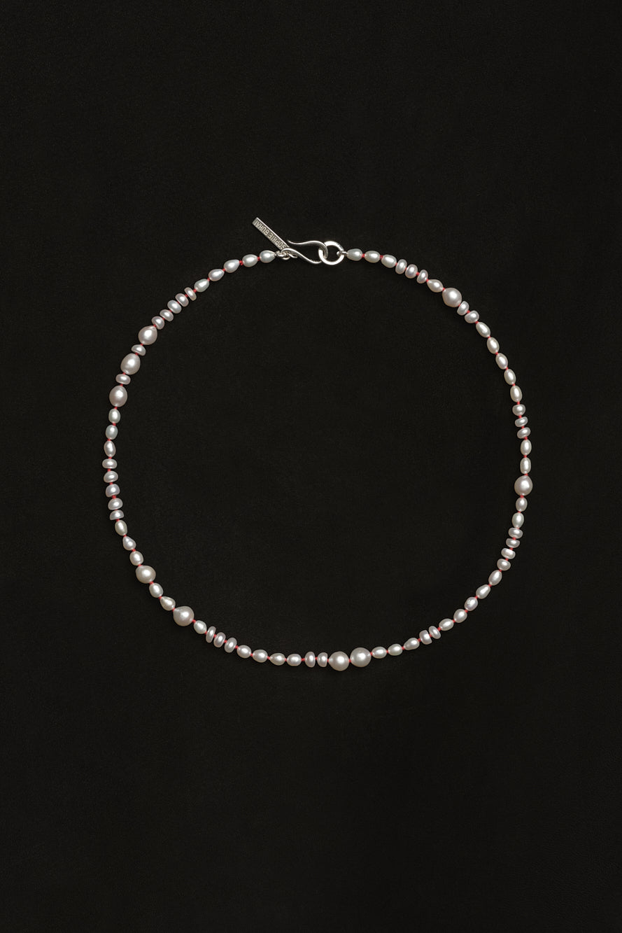 Necklace featuring a variety of freshwater pearls on a red silk string with a sterling silver closure. Available in three lengths.