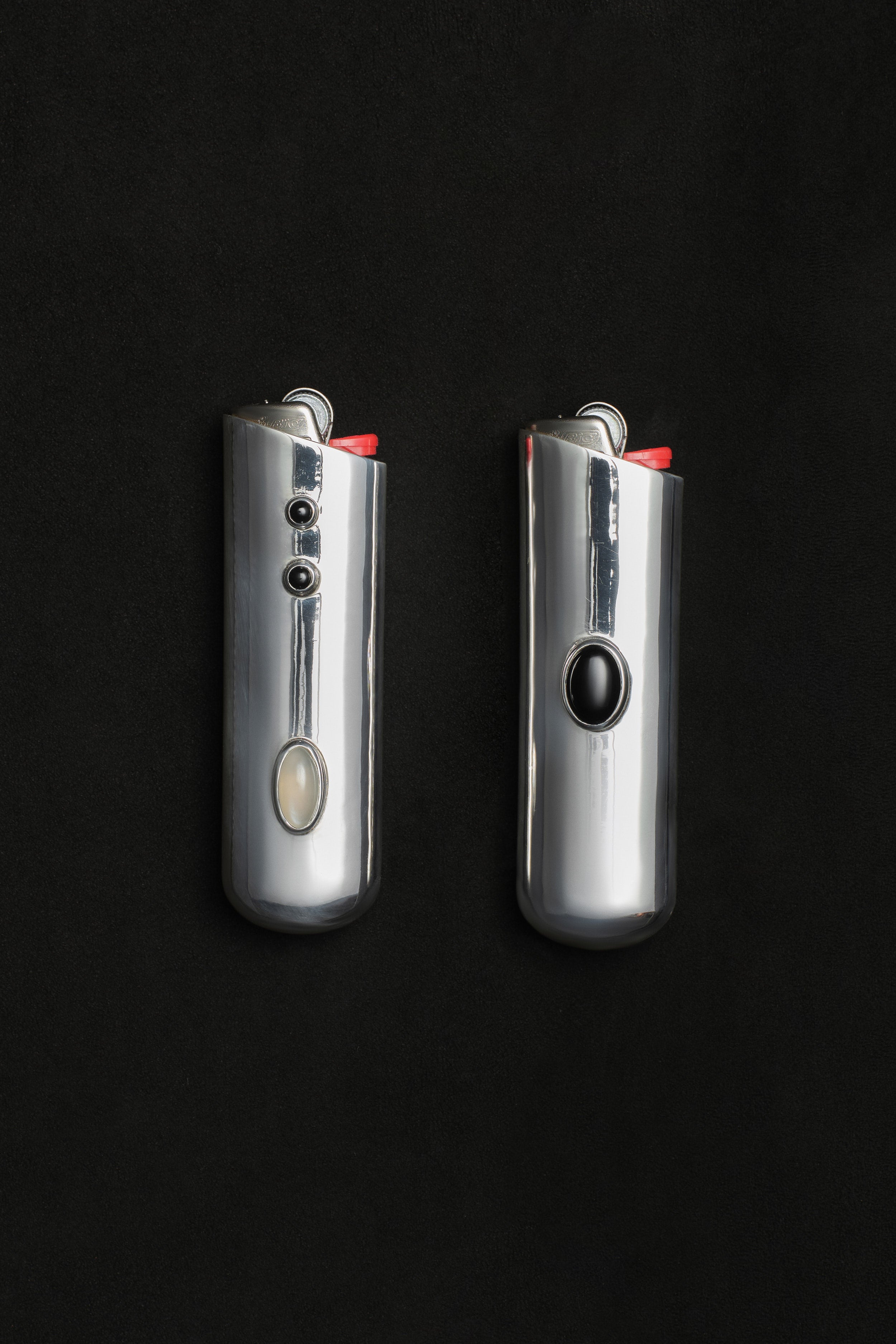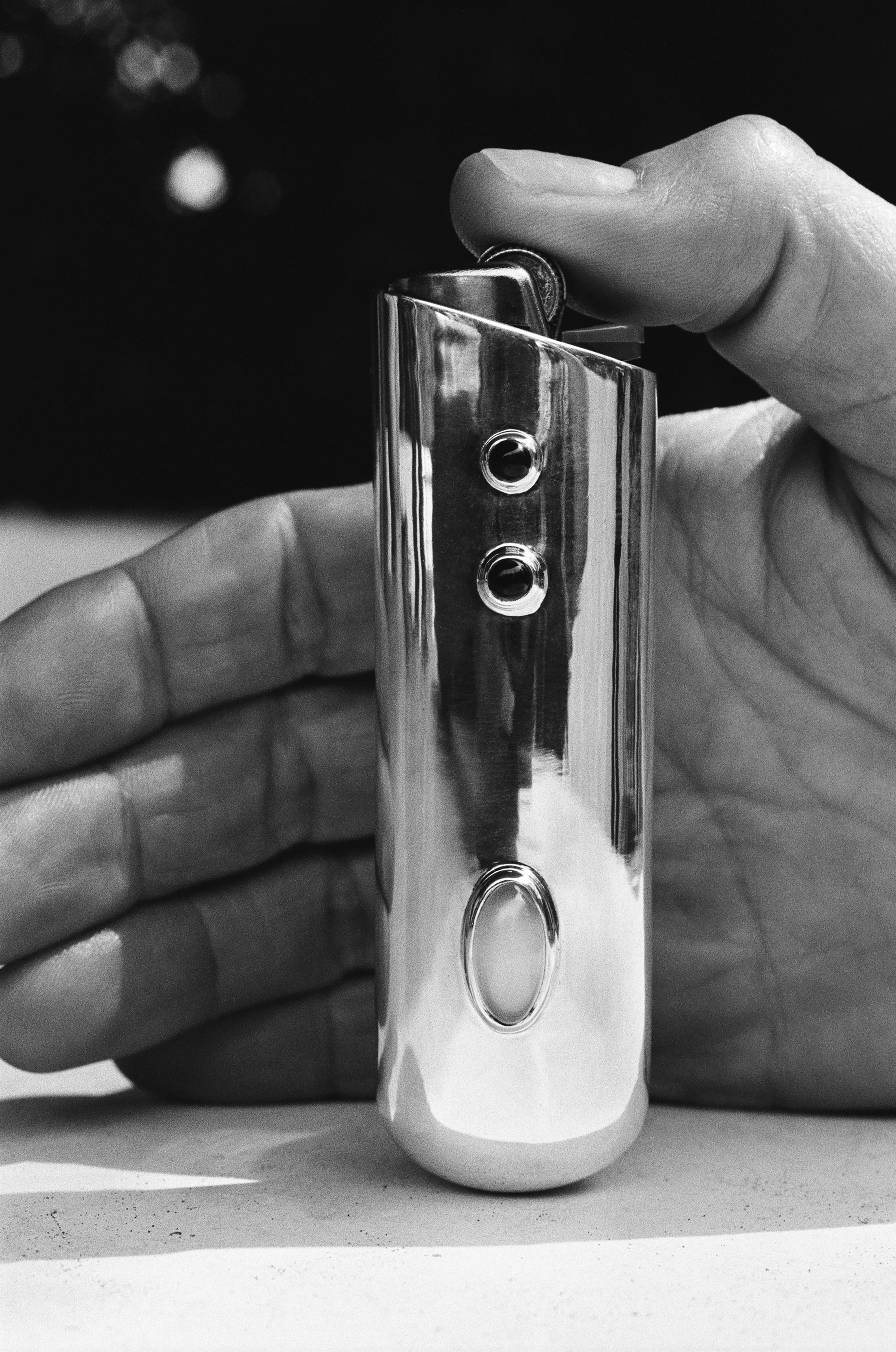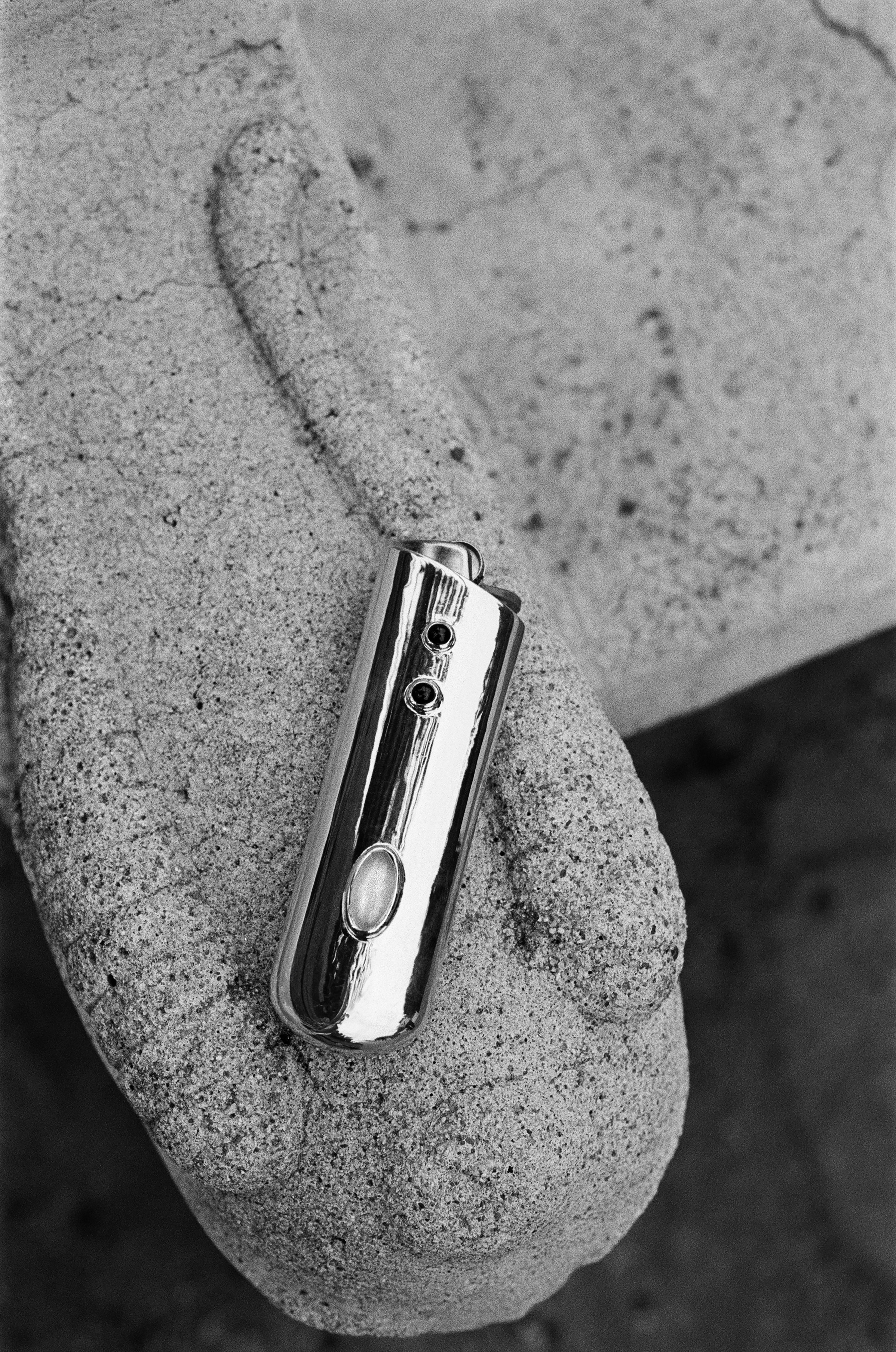 A sterling silver lighter case with bezel set moonstone and onyx.